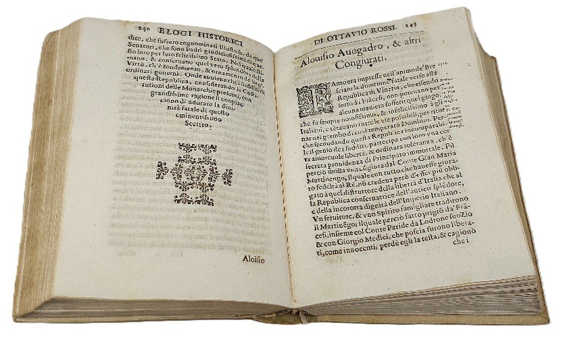 >in-4, 16 cc. nn. compreso frontespizio inciso, pp. 519 numerate, legatura coeva in p. pergamena, titolo ms. al dorso. Bel titolo inciso in rame, fregi e capilettera xilografici. Dedica dell'a. ai ''Signori Abbati, Avvocati, Diputati, Sindici et Consiglieri della città di Brescia'', sonetti di Lattanzio Stella e Giov. Parola ed altra dedica a Girol. Martinengo ed al conte G.B. Gambara e sonetto di Lodov. Federici in lode dell'autore. Prima edizione di opera rara e ricercata del dotto storico (Brescia 1570-1630, Accademico Errante, detto l'Agitato), la quale che fornisce utili notizie bio-bibliografiche di centinaia di ''bresciani illustri nelle lettere, nell'armi, et in altre virtù''. Bell'esemplare, forellino al margine interno dei primi 3 ff., qualche lieve alone agli angoli delle prime carte. STC., XVII sec., 800. Michel-Michel VII, 56. Lozzi 961: «Raro e importante». Cat. Vinciana 718. Schlosser-Magnino 569.