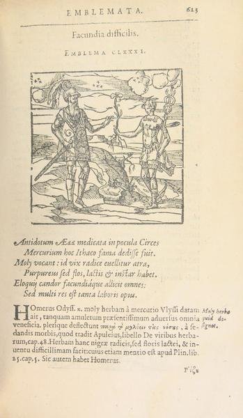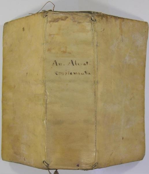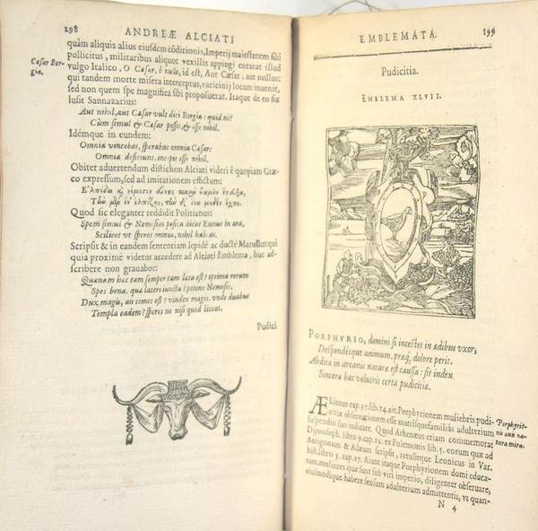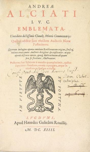 A Lugduni, Gulielmi Rouillij, 1614. Fort in-12 (17 x 11 cm) reliure plein velin du temps, titre manuscrit sur le dos, Lyon, Apud Hæredes Gulielmi Rouillii, 1614. Lyon, Apud Hæredes Gulielmi Rouillii, 1614. In-8, plein vélin du temps (un mors int. dét.), 20 f. non ch., 818 p., 11 f. (index). Illustré de 213 d'emblèmes gravées in-texte Andrea Alciato (ou Alciati), connu sous le nom d'André Alciat en français et d'Andreas Alciatus en latin, (1492 - 1550) jurisconsulte et écrivain italien de langue latine, émule d'Ulrich Zasius et de Guillaume Budé. Il fut l'un des premiers représentants du courant dit de l'humanisme juridique. Il était un correspondant d'Érasme. Ses Emblemata s’inspirent des Adages d'Érasme pour leur composition en forme de collection et pour leur constante référence à l’antiquité. Les deux recueils connurent un vif succès dès leur parution et fournirent aux hommes de la Renaissance des modèles et des clés qu'ils allaient utiliser dans leur vie intellectuelle et sociale. Son œuvre la plus connue sont les Emblèmes (Emblemata), recueil d'allégories en vers latins sur des sujets moraux, qui eut beaucoup de succès en Europe.