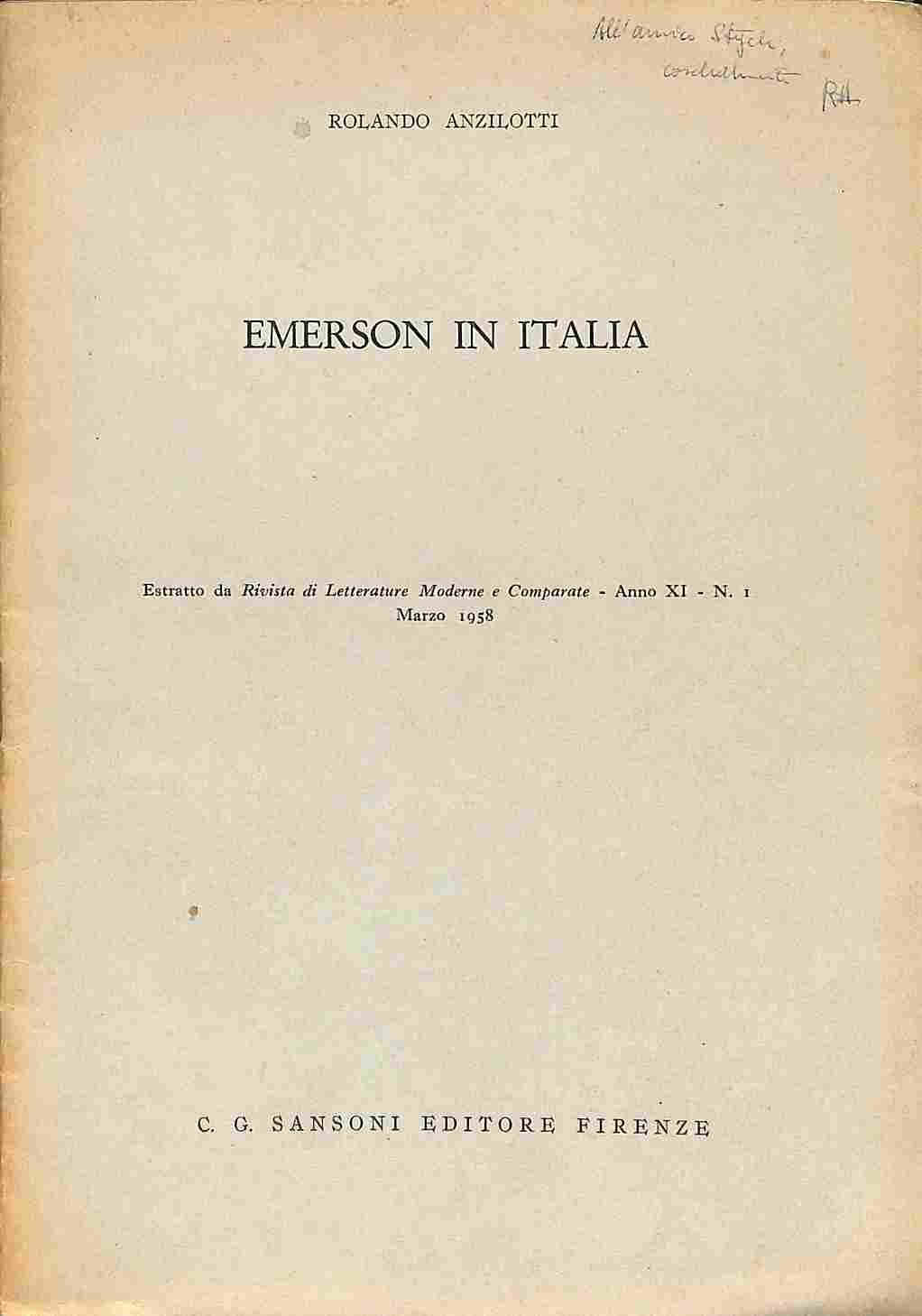 In 8 (cm 17 x 24,5), pp. 14. Brossura editoriale. Estratto editoriale dalla 'Rivista di Letterature Moderne comparate'. Saggio sulla fortuna di Ralph Waldo Emerson in Italia.