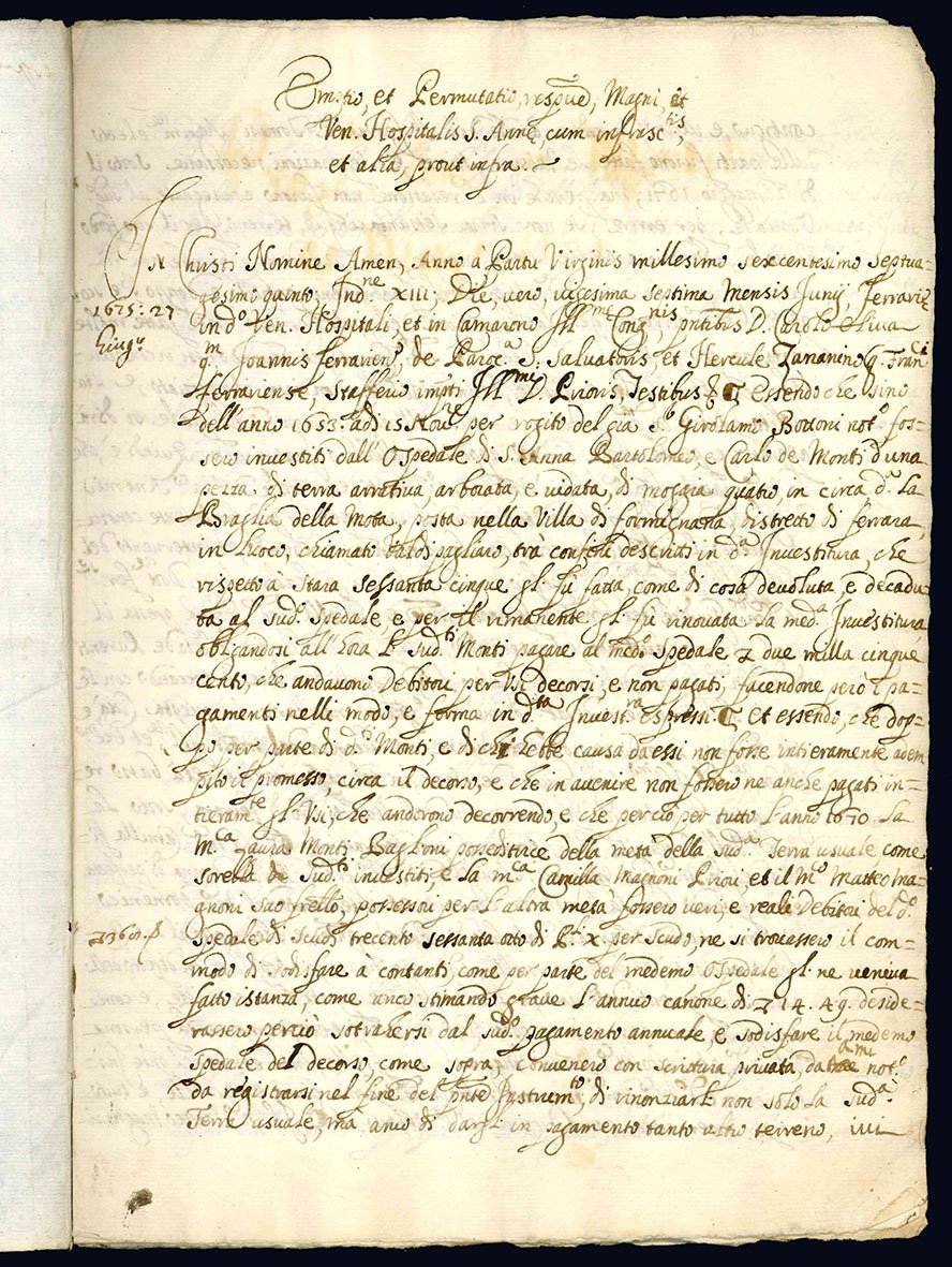 Emptio et Permutatio resque Magni et Ven. Hospitalis S. Annae, cum infrasc.tis, et alia prout infra. (Segue:) Relatio D. Ferranti de Tomaijs Agrimensoris pubblici ferrarien� 27 giugno 1675.