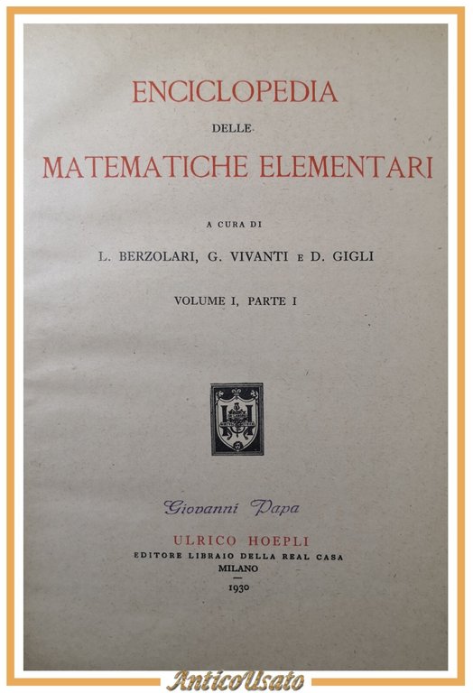 ENCICLOPEDIA DELLE MATEMATICHE ELEMENTARI Volume I parte I 1930 Hoepli Libro