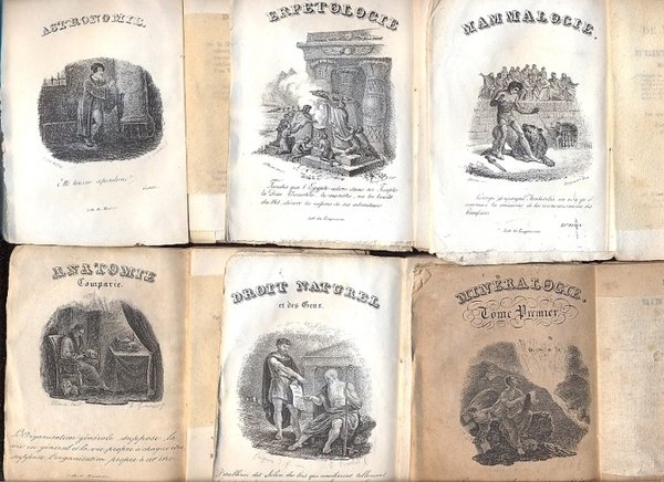 7 voll., in 24°, br. Barbe. Antiporte con inc. Lievi mende alle copp. Disp.: - Astronomie, 3 inc. - Minéralogie moderne (2 voll.)+2 inc.- Anatomie, + 2 inc. - Histoire naturelle des mammifères, è mancante l'inc. descritta sul front. - Histoire naturelle des reptiles, è mancante l'inc. descritta sul front. - Précis de la science du droit naturel et du droit des gens.