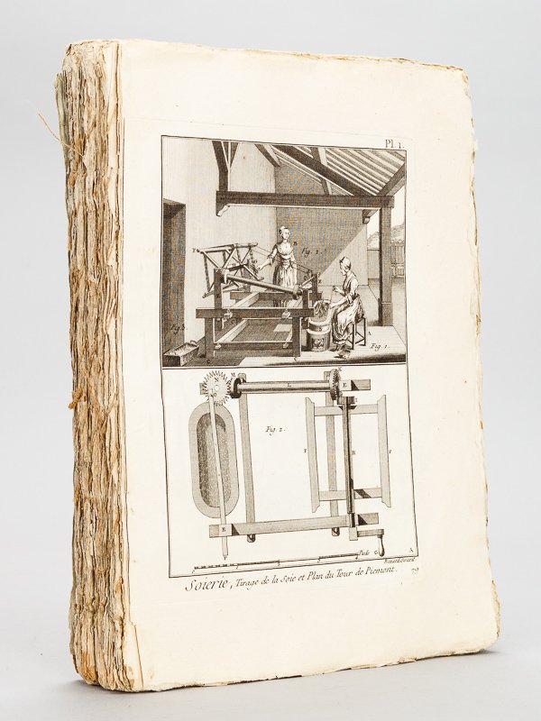 121 planches à savoir 94 planches simples et 27 planches doubles, extraites du Tome 6 du Recueil de Planches de l'Encyclopédie, par Ordre de Matières, [ Chez Panckoucke, à Paris, Chez Plomteux, Liège, 1786 ] Rare et bon ensemble de planches originales, extraites du sixième tome de Planches de l'Encyclopédie méthodique de Panckoucke. Cet ensemble est complet des 121 planches illustrant avec force détails l'industrie de la soie (débrochés et sans page de titre, qq. petits frott. et qq. rares mouill. angulaires, très bon état par ailleurs). Composée de 212 volumes, l'Encyclopédie méthodique connue sous le nom 'd'Encyclopédie Panckoucke' visait à compléter 'l'Encyclopédie ou Dictionnaire raisonné des sciences, des arts et des métiers' de Diderot et d'Alembert.