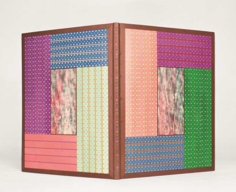 Edition de la Galerie Simon | Paris 1930 | 19 x 25 cm | relié | Entwurf einer Landschaft [Sketch of a Landscape] Édition de la Galerie Simon Paris 1930 | 19 x 25 cm | full calf First edition, one of 90 numbered copies on Holland paper signed by Carl Einstein and Gaston-Louis Roux on the justification page, the only issue with 10 copies on Japan paper and 10 on Chapelle paper. With five full page black lithographs by Gaston-Louis Roux, one of which on the frontispiece. Binding in full brown-pink box, spine with blue, pink and green title in œser, significant inlaid decoration on the boards, four bands of five strips of pink, purple, green and blue calf, arranged around a central piece of rectangular multi-colored marbled box, endpapers in flesh-side pink suede, wrappers and spine preserved, all edges gilt, dust jacket in half brown-pink box, spine with blue, pink and green title in œser, slip case lined with brown-pink box, binding signed by Georges Leroux and dated 1994. Carl Einstein is an anarchist writer, art historian, friend of George Grosz, Georges Braque and Pablo Picasso, collaborator of Jean Renoir, lived through the wars and revolutions that shook Europe during the first part of the twentieth century. He volunteer during the Spanish civil revolution in 1936 and went to Barcelona to fight in the ranks of the Confédération nationale du tra vail (National Labor Confederation), before joining the Groupe international de la Colonne Durruti (Durruti Column International Group). Of Jewish faith, he committed suicide in 1940 to avoid failing into the hands of the Nazis. Magnificent copy perfectly set in a full inlaid box binding signed by Georges Leroux, one of the greatest binders of the second part of the 20th century. * [FRENCH VERSION FOLLOWS] | Edition originale, un des 90 exemplaires numérotés sur Hollande et signés par Carl Einstein et Gaston-Louis Roux sur la page de justification, seul tirage avec 10 Japon et 10 Chapelle. Ouvrage illustré de cinq lithographies en noir à pleine page de Gaston-Louis Roux, dont l'une en frontispice. Reliure en plein box brun-rose, dos lisse titré à l'œser bleu, rose et vert, importants décors mosaïqués sur les plats, quatre bandes de cinq bandelettes perforées de veau rose, violet, vert et bleu, disposées autour d'une pièce centrale rectangulaire de box marbré multicolore, gardes et contreplats de daim rose chair, couvertures et dos conservés, toutes tranches dorées, chemise en demi box brun-rose, dos lisse titré à l'œser bleu, rose et vert, étui bordé de box brun-rose, reliure signée de Georges Leroux et datée de 1994. Ami de George Grosz, Georges Braque et Picasso, collaborateur de Jean Renoir, historien de l'art, écrivain et anarchiste, Carl Einstein a traversé les guerres et révolutions qui ont ébranlé l'Europe de la première moitié du XXème siècle. Volontaire pendant la révolution civile espagnole de 1936, il rejoint Barcelone pour combattre dans les rangs de la Confédération nationale du travail, avant d'intégrer le Groupe international de la Colonne Durruti. De confession juive, il se suicide en 1940, afin d'éviter de tomber aux mains des nazis. Magnifique exemplaire parfaitement établi dans une reliure en plein box mosaïqué signée de Georges Leroux, l'un des plus grands relieurs de la deuxième partie du XXème siècle.