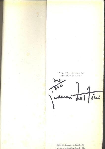 IN 4° ( cm.23 X 32 ), pp.( 2 ) 19 ( 3 ), COPERTINA IN BROSSURA EDITORIALE NERA CON TITOLO<BR>BIANCO. 8 INCISIONI IN NERO a pp. ( cm.21 X 14 ; 9,5 X 21 ). GIANNI BERTINI ( 1922 - 2010 ),<BR>PITTORE ITALIANO. ESORDISCE NEL 1946 CON DIPINTI TRA L'ESPRESSIONISMO E IL POST CUBISMO. DOPO L'INCONTRO CON S. TIMPANARO, PASSA ALLA PITTURA ASTRATTA. NEL<BR>1950 ADERISCE AL M.A.C. ( MOVIMENTO ARTE CONCRETA ). NEL 1951 FIRMA IL MANIFESTO<BR>CONTRO LO STILE E SI TRASFERISCE A PARIGI.NEL 1962 FIRMA IL MANIFESTO DELLA MEC - ART, ABBREVIATIVO DI MECHANICAL - ART, OVVERO UN'ARTE CHE SFRUTTA I PROCEDIMENTI FOTOGRAFICI PER OTTENERE UN'ELABORAZIONE MECCANICA DI UNA NUOVA IMMAGINE RIPORTATA POI SU TELA O METALLO SU CUI L'ARTISTA INTERVIENE PITTORICAMENTE. NEL 1970 E' COMMISSARIO ALLA BIENNALE DI VENEZIA. PRIMA EDIZIONE<BR>DI 210 ESEMPLARI NUMERATI E FIRMATI DALL'AUTORE. NS. ESEMPLARE, 70 / 210.<BR>OTTIMA CONSERVAZIONE DI QUESTA RARA PUBBLICAZIONE. ID 3128
