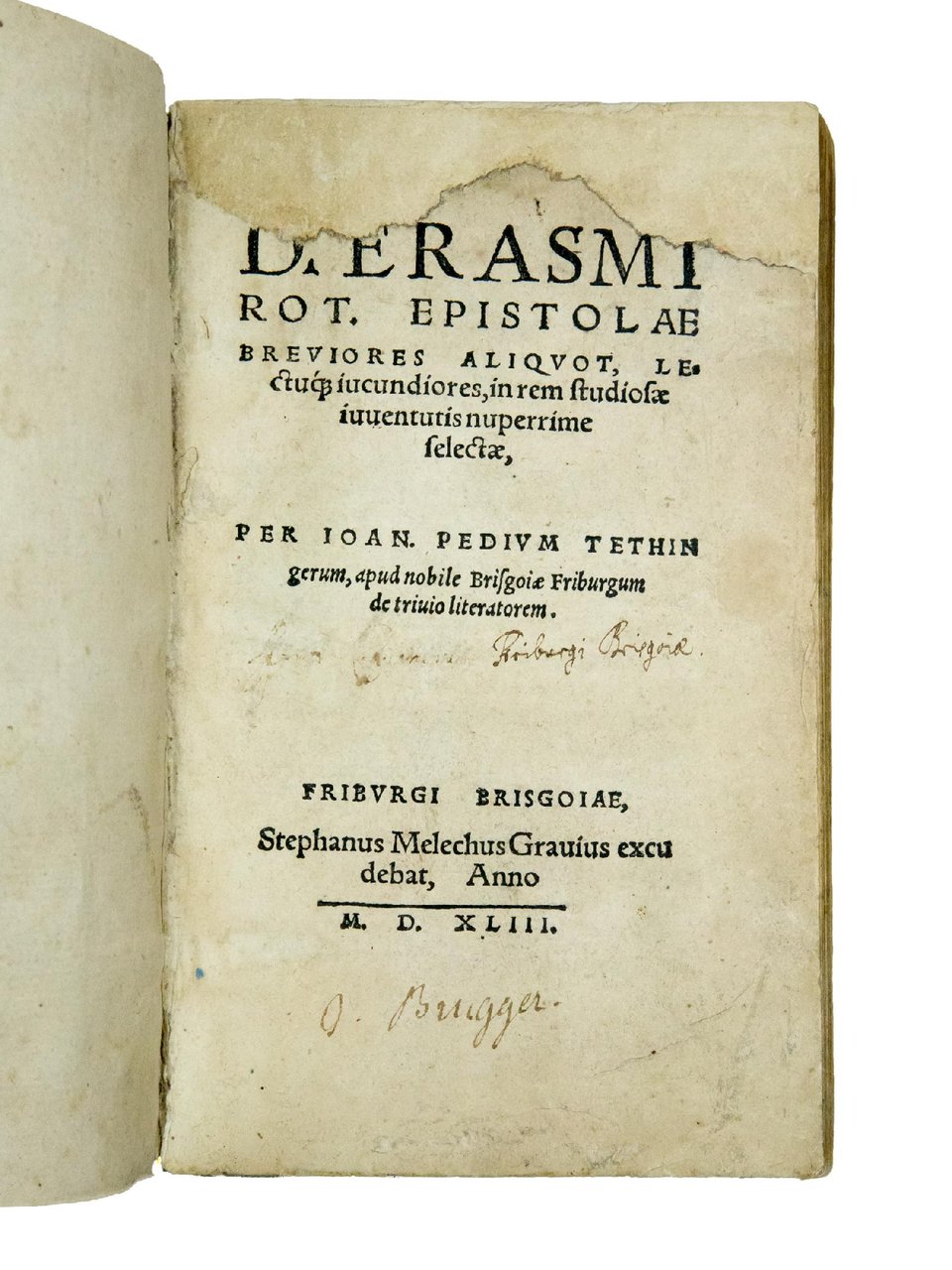 ONLY EDITION of this selection of Erasmian letters published by the poet and historian Johannes Tethinger (fl. 1st half of the 16th century). It was intended for school boys as a manual of model letters. Probably Tethinger had in hands the similar volume published at Basel by Bartholomäus Westheimer in 1538.