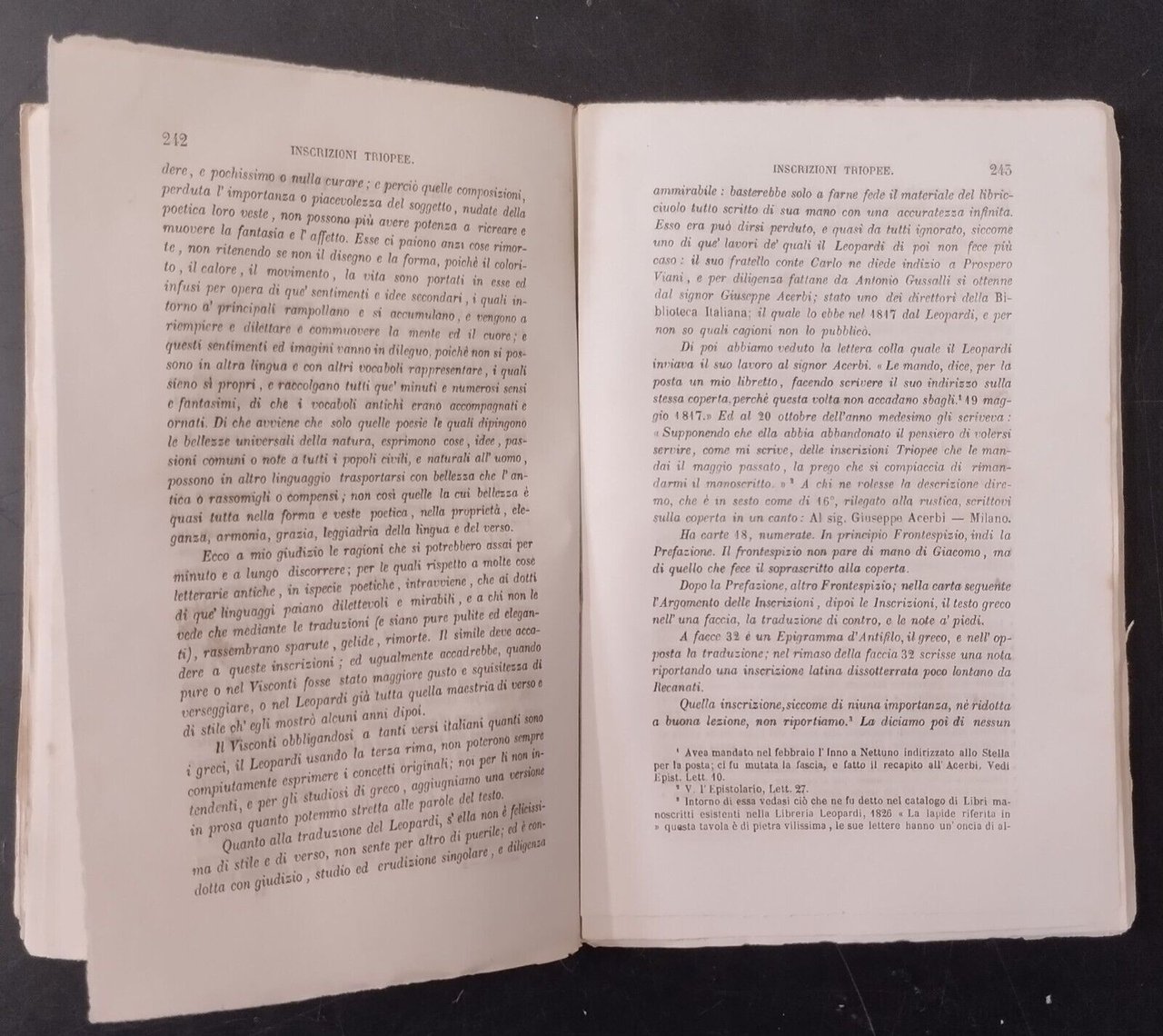 EPISTOLARIO DI GIACOMO LEOPARDI con le inscrizioni greche triopee tradotte e le lettere di Pietro Giordani e Pietro Colletta all'autore; raccolto e ordinato da Prospero Viani.