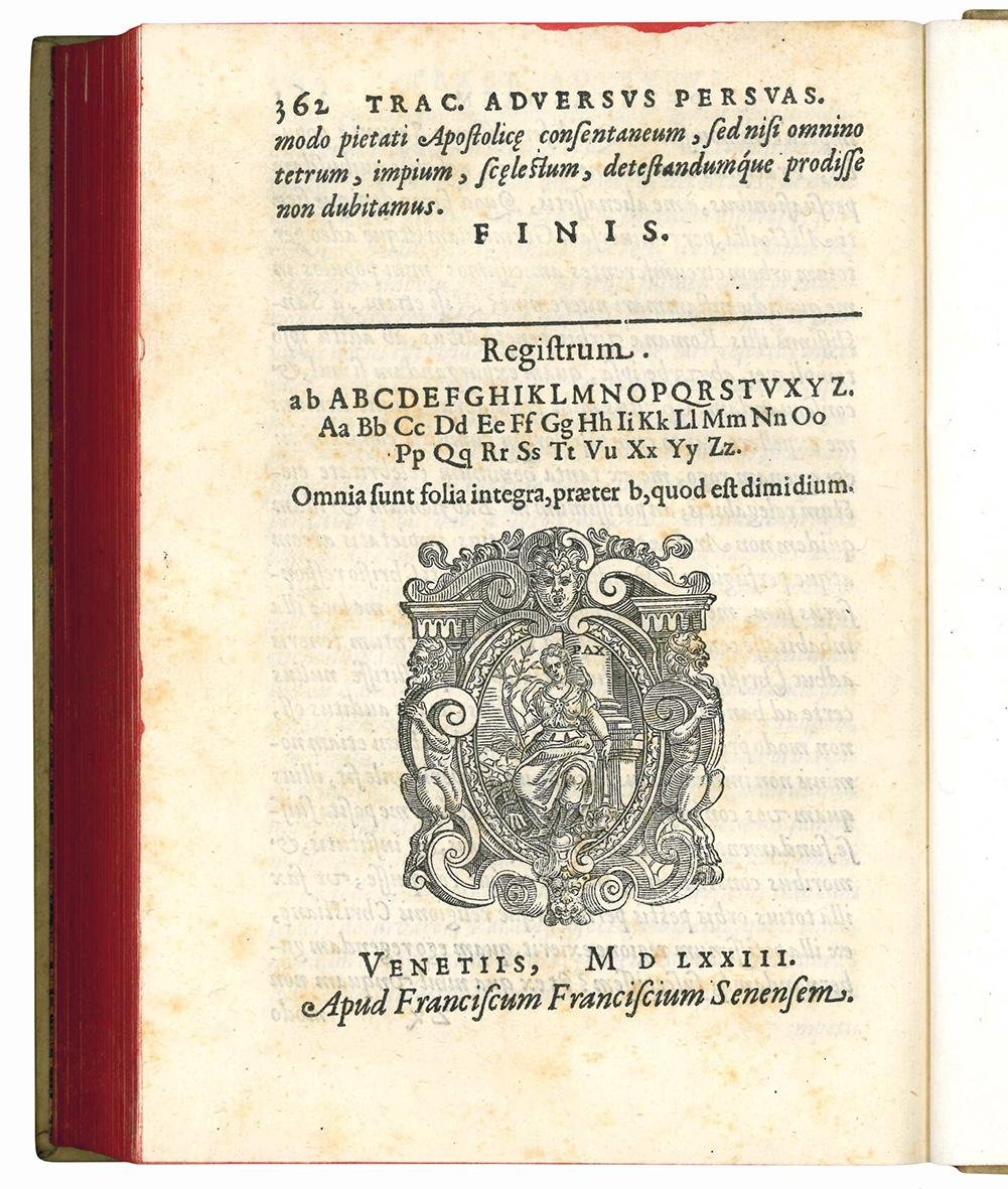 4to (197x140 mm). [12], 362 pp. Collation: a4, b2, A-Z4, Aa-Yy4, Zz2. Lacking the final blank Zz2. With the printer's device on the title page. Early 19th-century gilt vellum over boards, lettering piece on spine, marbled endleaves, red edges. On the title page ownership's inscription and stamp of the Altemps library. Some light staining, but a very good, fresh copy.