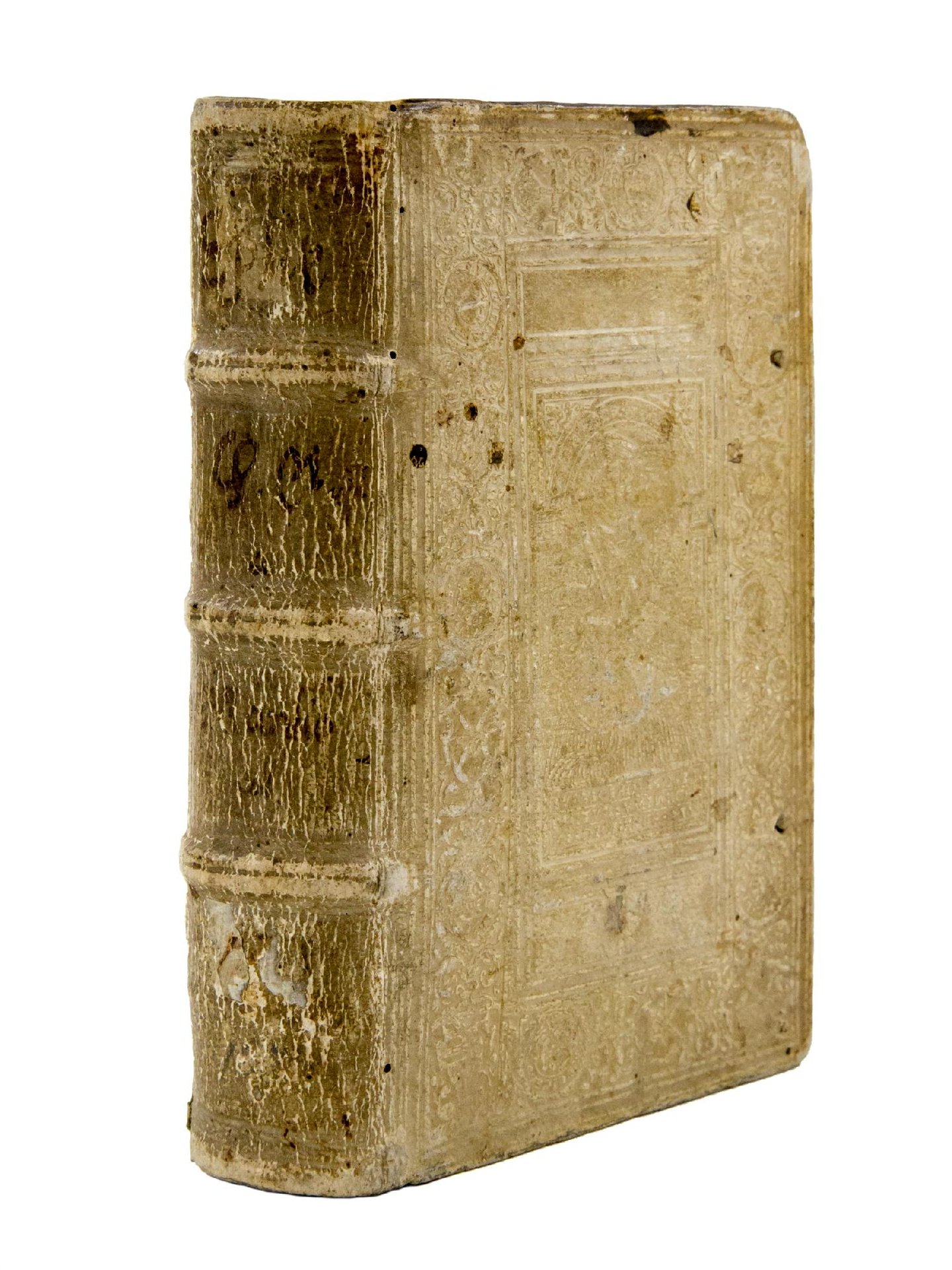 8vo. (16), 550 (i.e. 590, with errors in the pagination), (2) pp. α8, a-z, A-O8. With the printer's device on the title-page. Contemporary blind-stamped pigskin. With the autograph entry of ownership of Johannes Sagittarius (Schütz), Protestant theologian (1531-1584), and the engraved book plate of the jurist Christian Carl Ludwig von Savigny (1684-1740).