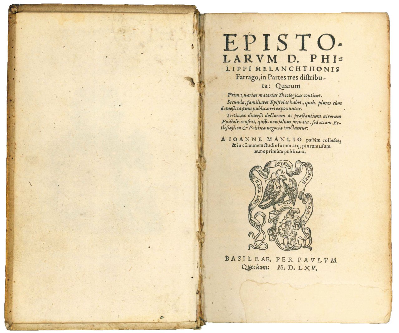The volume contains 422 pieces (70 of which are not by Melanchthon) and opens with a prefatory letter by Manlius to Christoph Jonas, Thomas Matthias, and Christoph Meienburger, all councilors to George Frederick of Brandenburg-Ansbach, to which follows a letter from Heinrich Claviger to Manlius dated [August 2], 1564.