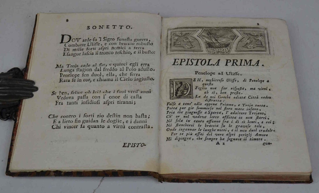 Cm. 19, pp. (8) 179 (1). Frontespizio in rosso e nero, capolettera istoriati e testate assai decorative. Leg. coeva in piena pelle. Tagli dorati. Dorso con mancanze, peraltro esemplare genuino ed in buono stato di conservazione.