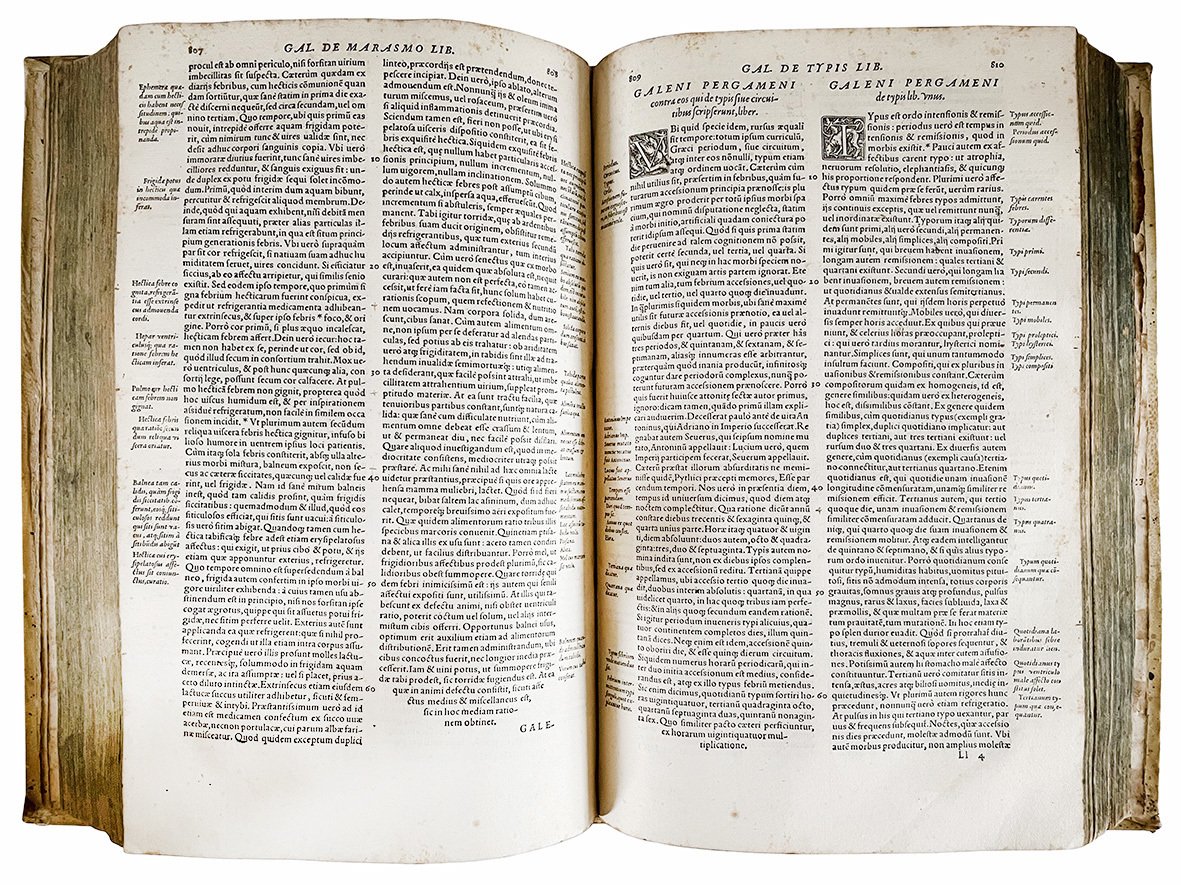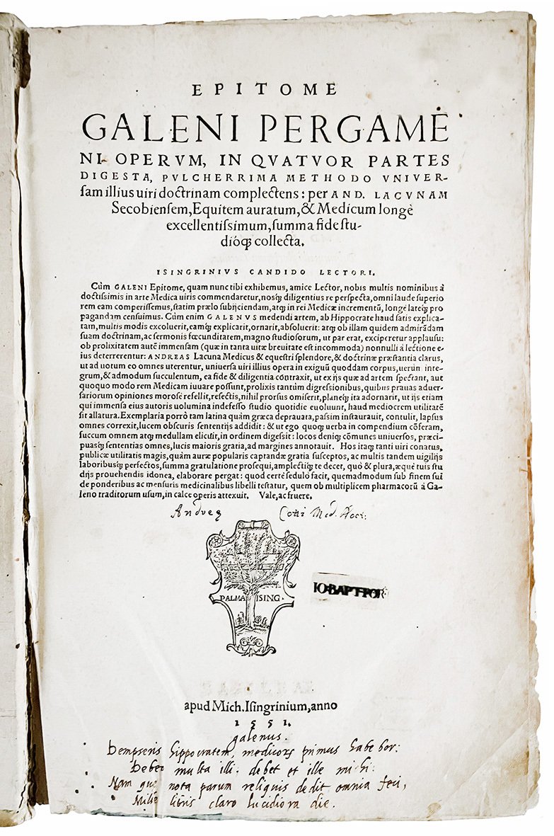 Seconda edizione (la prima apparve a Venezia nel 1548) di questa epitome delle opere di Galeno curata dal medico spagnolo Andrés de Laguna, che tenta qui di conciliare le dottrine di Galeno con quelle di Ippocrate.