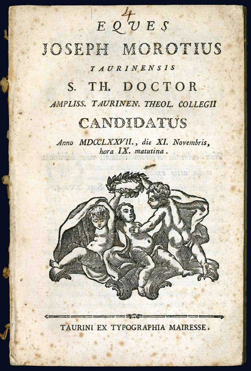 Eques Joseph Morotius Taurinensis S. Th. Doctor ampliss. Taurinen. Theol. collegii candidatus. Anno MDCCLXXVII., die XI. Novembris, hora IX. matutina.