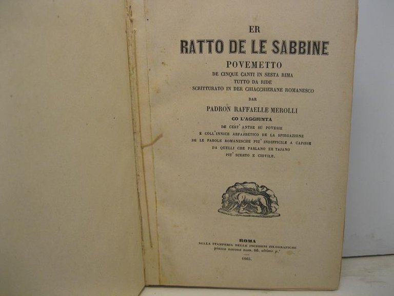 Er ratto de le sabbine povemetto de cinque canti in sesta rima tutto da ride scritturato in der chiacchierane romanesco dar padron Raffaele Merolli co l'aggiunta de cert'antre su povesie e coll'innice arfabetico de la spiegazione de le parole romanesche piu' indifficile a capisse da quelli che parlano er tajano piu' scerto e ciovile