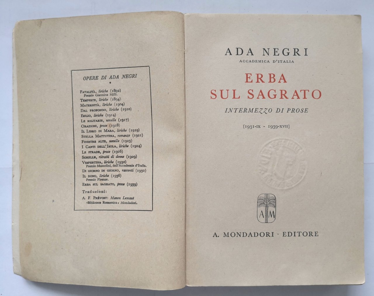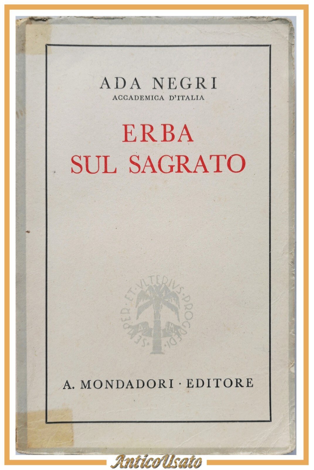 ERBA SUL SAGRATO intermezzo prose 1931 1939 di Ada Negri 1942 Mondadori Libro
