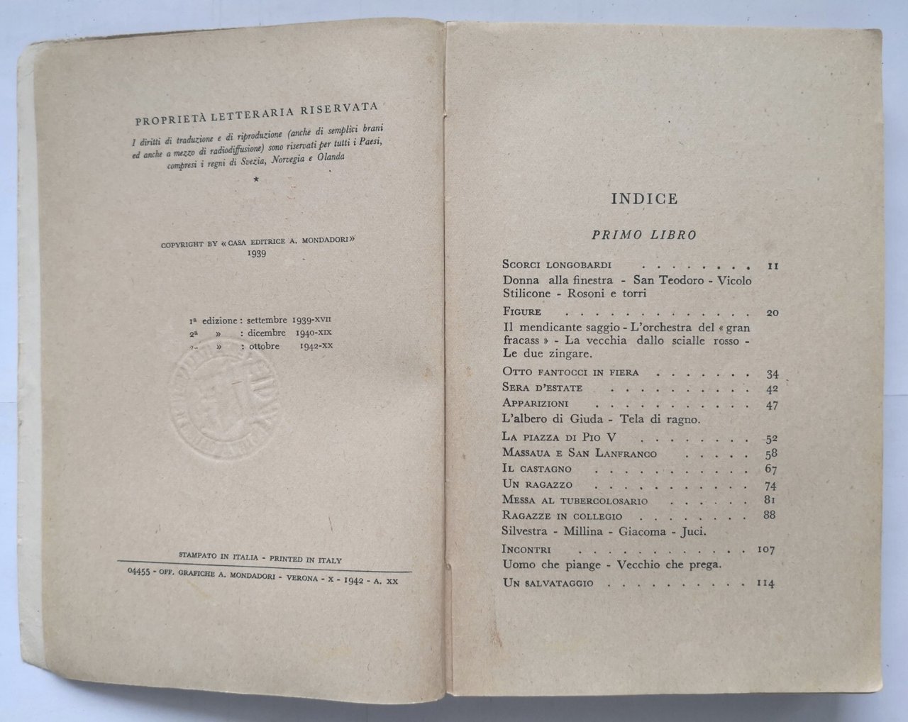 Editore Mondadori, 1942. 312 pagine. Copertina editoriale in brossura. Stato di conservazione: molto buono (pagine normalmente ingiallite, dedica anonima all'occhietto, residui di nastro adesivo alla copertina) Libro usato narrativa letteratura italiana