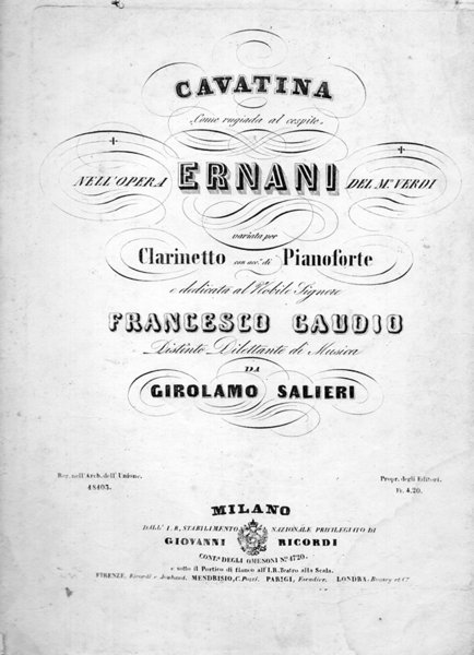 Partitura “Come rugiada al cespide”, cavatina dell’opera Ernani, variata per clarinetto con acc.o di pianoforte e dedicata Al Nobile Signore Francesco Gaudio da Girolamo Salieri. P.N. L18103L. Gora d’acqua al margine inferiore delle pagine.