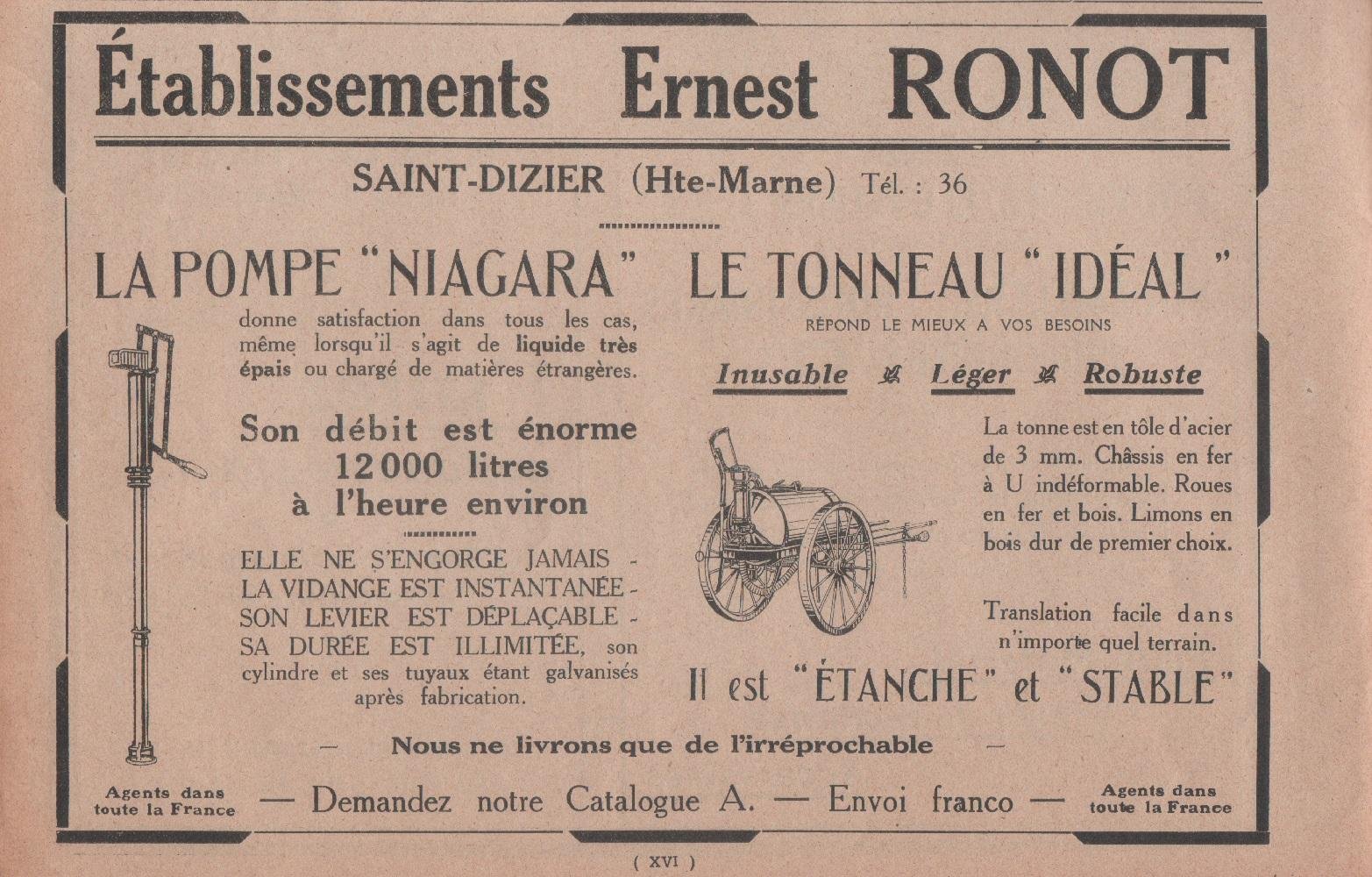 Ernest Ronot. Pompe Niagara, tonneau Ideal. Advertising 1926