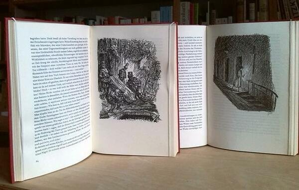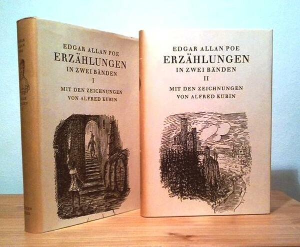 Gr.-8°. 433 (1) SS.,3 Bll.; 435 (1) SS., 2 Bll. Mit 83 Illustr. von Alfred Kubin. Orig.-Lwd. mit goldgepr. Rtit. und illustr. Orig.-Umschl. (Alfred Kubin) in Orig.-Papp-Schuber. Marcks B 9. - Sammelausgabe aller von Kubin je illustrierten Erzählungen Poes, insges. 41, darunter "Der Untergang des Hauses Usher" und "Der Doppelmord in der Rue Morgues", in der Übersetzung von Hedda Eulenberg. - Kubins Illustrationen wurden illustrierten Ausgaben der Werke Poes entnommen, die bereits zuvor zwischen 1909 und 1911 im Verlag Georg Müller, München, sowie 1920 im Propyläen Verlag Berlin erschienen waren (vgl. Marcks, a.a.O.). - Rücken der Orig.-Umschll. und Schuber gering gebräunt und tls. mit kl. Randläsuren. Sonst gute, saubere Exemplare. Phantastische Literatur 19. Jahrhundert, Nordamerika, Übersetzung, Kunst, Buchkunst 20. Jahrhundert, Expressionismus, illustrierte Ausgabe, Nachdruck, BRD, nach 1945 Bücher Deutsch