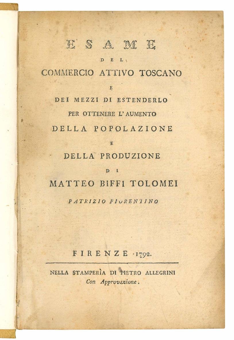 Esame del commercio attivo toscano e dei mezzi di estenderlo, per ottenere l'aumento della popolazione e della produzione di Matteo Biffi Tolomei patrizio fiorentino.