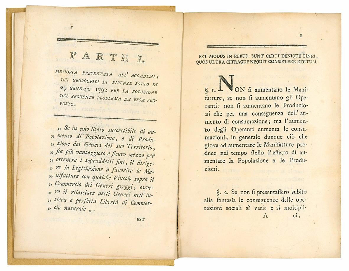 Rara edizione originale di questo importante saggio scritto per rispondere ad un quesito proposto dall'Accademia dei Georgofili riguardante l'introduzione o meno di vincoli sull'esportazione della materia greggia delle principali manifatture fiorentine (le Arti della seta e della lana) e sull'importazione dei corrispondenti manufatti esteri. Il saggio del Biffi Tolomei, pur non vincendo il concorso, ottenne comunque l'accessit. L'opera si divide in due parti: nella prima l'autore propone una soluzione al problema "se i vincoli alle materie gregge possano essere utili o dannosi all'aumento della produzione e della popolazione", mentre nella seconda fa un confronto tra lo stato della Toscana prima della liberta' frumentaria e lo stato attuale della medesima, in rapporto alla popolazione e alla produzione. Biffi Tolomei esorta poi i Toscani ad aumentare il commercio attivo e a diminuire le importazionei delle "manufatture estere specie simili alle nostre" (cfr. F. Diaz, Biffi Tolomei, Matteo, in: "Dizionario Biografico degli Italiani", X, 1968 s.v.).