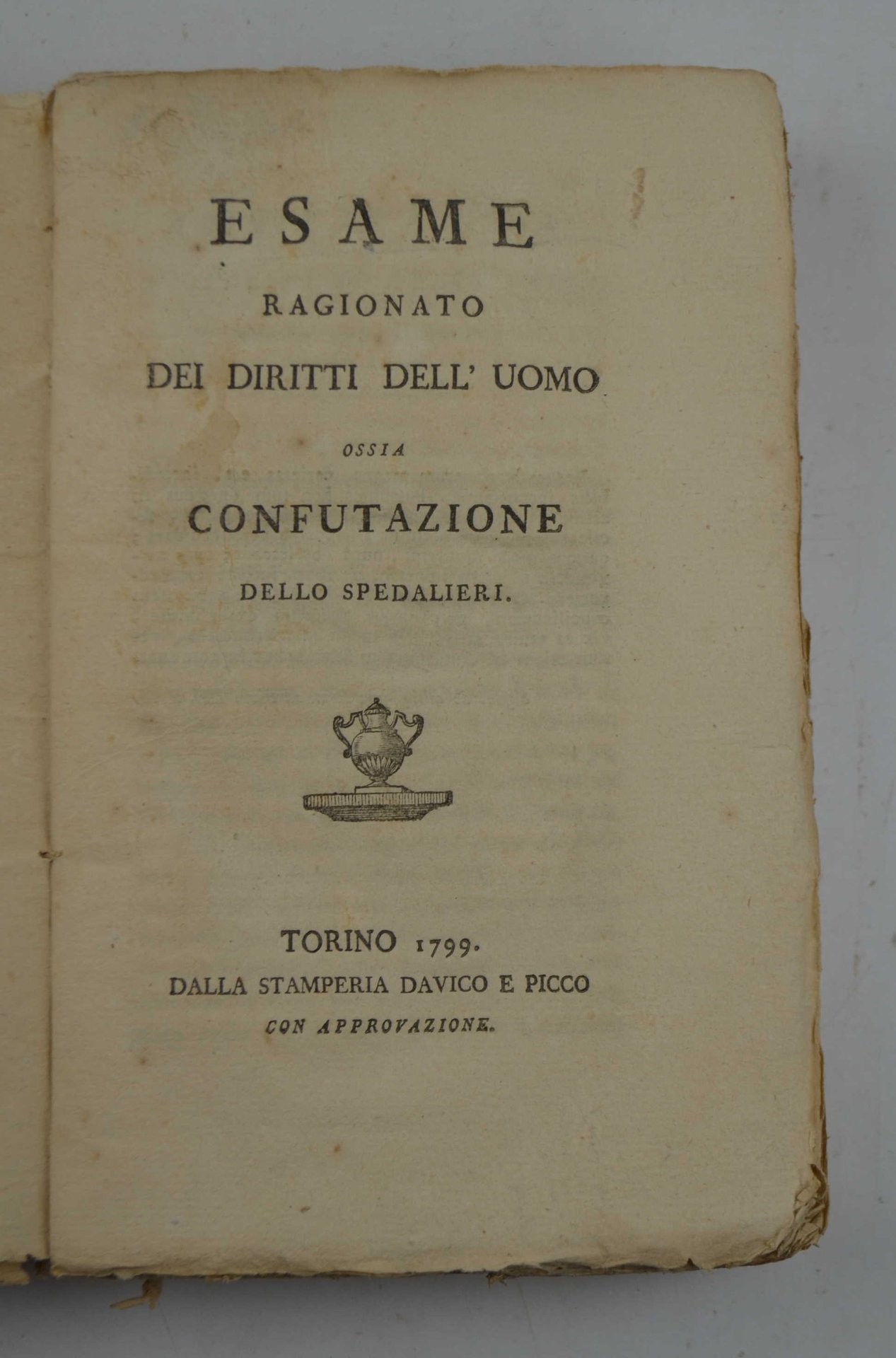 Cm. 20,5, pp. xxxii, 292. Semplice legatura coeva in carta. Esemplare genuino e marginoso, ben conservato e stampato su carta d'ottima qualità. Edizione originale ed unica di quest'opera del Della Valle che scrisse per espresso incarico della corte sabauda e si rivelò per lui una sfortunatissima esperienza. Suscitò infatti la replica dei vercellese G. A. Ranza (Denuncia ai patriotti contro il libro di frate G. D. m.c. intitolato Esame ragionato… Torino 1800) con un processo a suo carico e il successivo abbruciamento dell'opera incriminata in piazza Castello, durante una tumultuosa manifestazione. Cfr. Treccani.