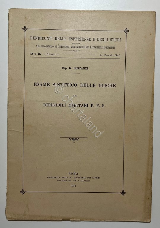 Rendiconti delle Esperienze e degli Studi - G. Costanzi - Esame Sintetico delle Eliche dei Dirigibili Militari P1, P2, P3 - N. 1 - 31 Gennaio 1912 Testo in lingua italiana. Pagine 36 con illustrazioni e tavole. Copertina morbida. Condizioni molto buone.