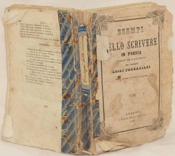 In 16. Dim. 18x12 cm. Pp. 388. Edizione del 1856 di questa interessante opera letteraria di Luigi Fornaciari (1798-1858). L'opera è in un volume ed è completa. All'interno numerosi testi per scrivere bene in poesia. Nella prima parte dedica allo stampatore lucchese Giuseppe Giusti poi i vari testi: favole; narrazioni; descrizioni (Dante, Poliziano, Tasso ecc.), Personificazioni, Stile didascalico, Sermoni, Sonetti (Fra Guittone, Dante, Petrarca, Boiardo, Della Casa, TassoPirro schettini ecc.), Canzoni. In mediocri condizioni. Copertina in mediocri in ottime condizioni generali con usure e parti mancanti ai margini e dorso coperto da carta. Piatto posteriore assente. Legatura in mediocri condizioni. All'interno le pagine si presentano in discrete condizioni con fioriture e mende. Piegature agli angoli e ai margini. Perdita di testo all'ultima pagina di indice. Edition of 1856 of this litterary work by Luigi Fornaciari (1798-1858). The work is in one volume and it is complete. Insdie different texts to write in poetry. In the first part dedication to the publisher from Lucca Giuseppe Giusti then the different texts: tales, narration; descriptions (Dante, Poliziano, Tasso ecc.), Personifications, Didascalic style, Sermons, Sonnets (Fra Guittone, Dante, Petrarca, Boiardo, Della Casa, TassoPirro schettini ecc.), Songs. In poor conditions. Editorial cover in poor general conditions with wearings and missing parts in the edges and spine covered by paper. Back plate is missing. Binding in poor conditions. Inside pages are in fair conditions with foxings and usage signs. Foldings in the corners and edges. Loss of text in the last page of index.<BR><BR>