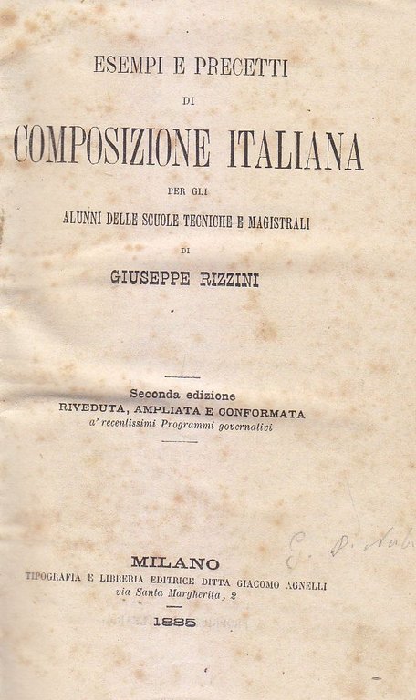 ESEMPI E PRECETTI DI COMPOSIZIONE ITALIANA Giuseppe Rizzini 1885 Agnelli Libro