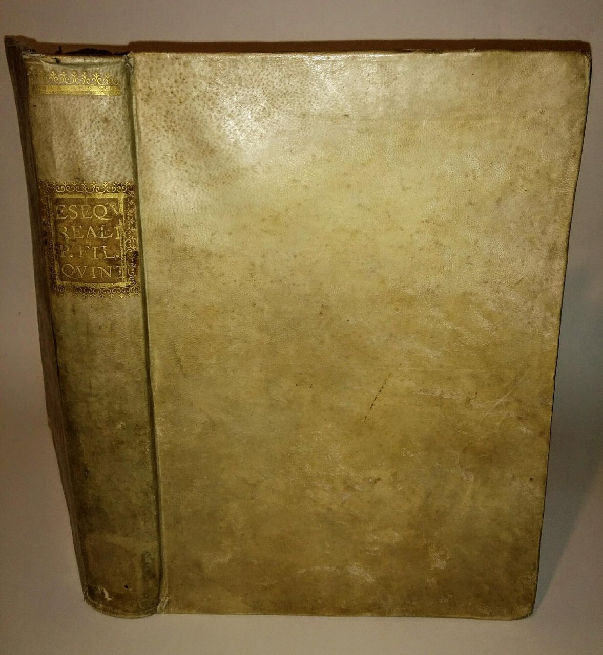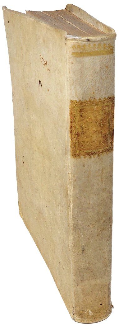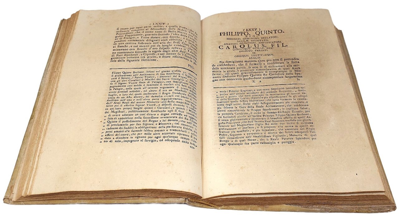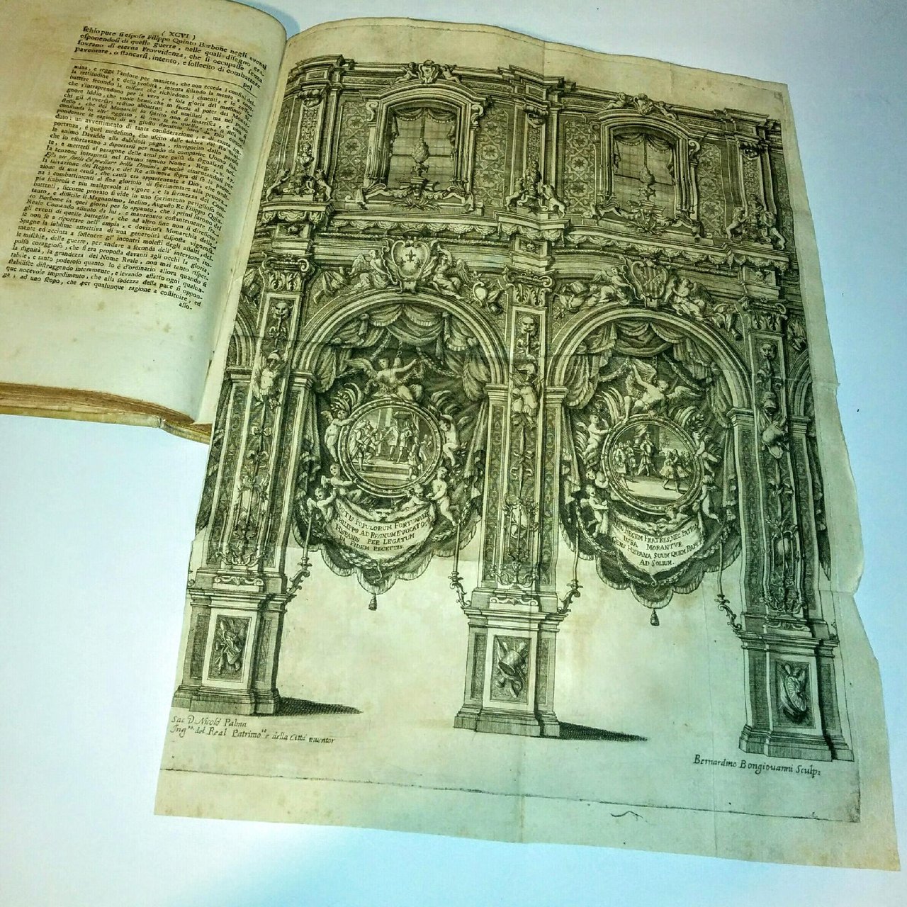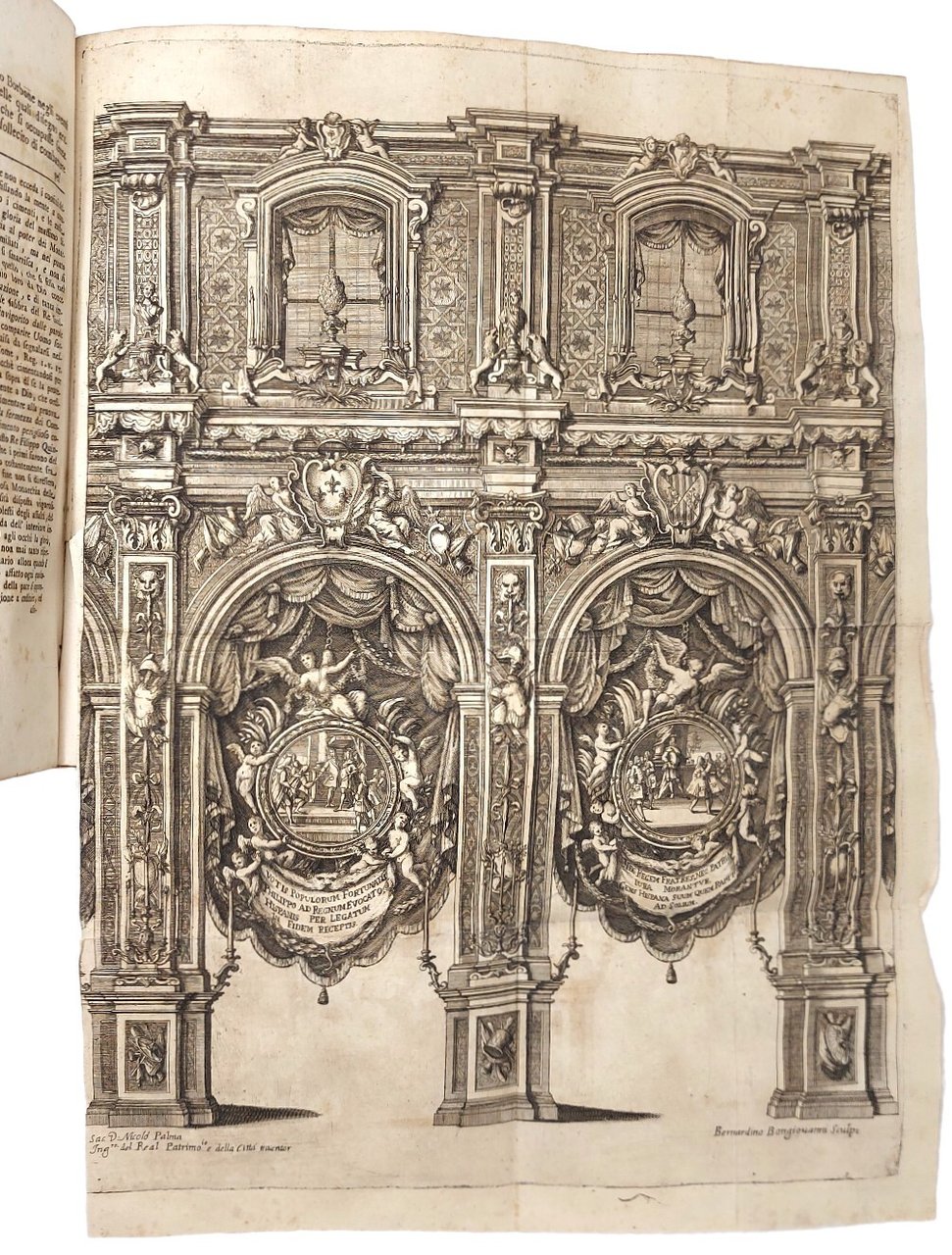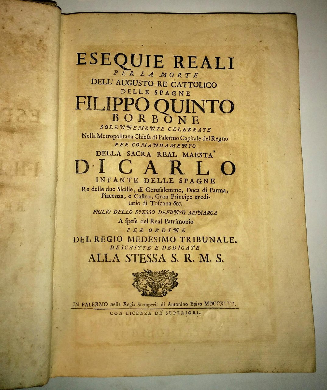 >in-folio, pp. XXVI, CCXLVI, (2 bianche), XLI, (2 bianche), legatura coeva in pergamena, tassello in oro al dorso. Le prime 246 pagine descrivono gli apparati e le cerimonie per le esequie di Filippo V di Borbone; la sezione finale è invece la trascrizione dell'orazione funebre recitata in Duomo dal Sacerdote Vincenzo Pupella. Privo dell'antiporta con ritratto del sovrano; completo di 2 tavole ripiegate f.t., disegnate dal famoso architetto Nicolò Palma ed incise da Bongiovanni. La prima rappresenta gli archi del Duomo decorati con festoni e medaglioni con ritratti di personaggi evocanti episodi della vita del Re; la seconda il monumentale cenotafio per il Monarca defunto. Splendido esempio dell'arte incisoria e tipografica dell'epoca. Ottimo esemplare (al titolo piccolo timbro a secco di Biblioteca Reale con gigli di Francia). Mira II, 330. Moncada 1830. vola, Ricerche Storiche sulla Tipografia Siciliana, 97: ''Magnifica edizione''. Narbone, Bibl. Sicula, I, 373.