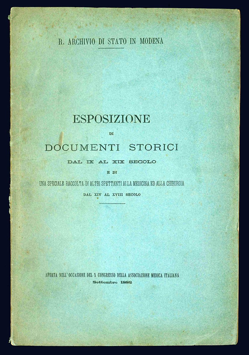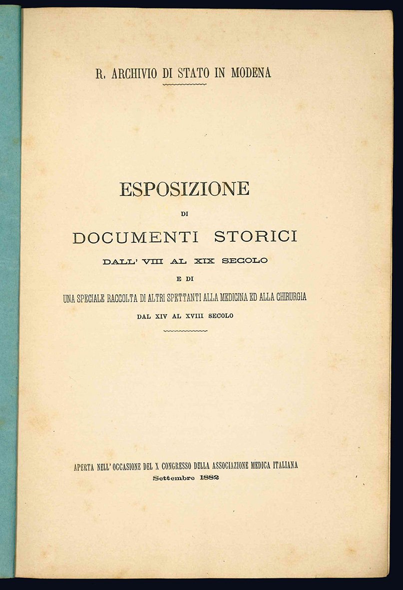 Il titolo alla copertina anteriore differisce da quello del frontespizio: Esposizione di documenti storici dall'IX al XIX secolo e di una speciale raccolta di altri spettanti alla medicina ed alla chirurgia dal XIV al XVIII secolo.