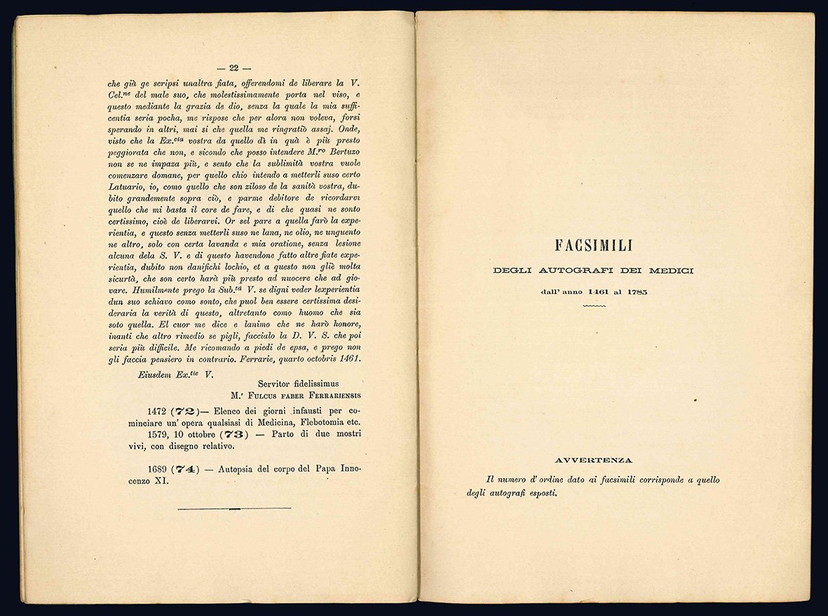 In 8vo (mm 233x158); pp. 22, [2], con [2] c. di tav. fuori testo contenenti facsimili degli autografi dei medici dall'anno 1461 al 1785. Brossura editoriale. Copertine un po' sbiadite, carta leggermente brunita.