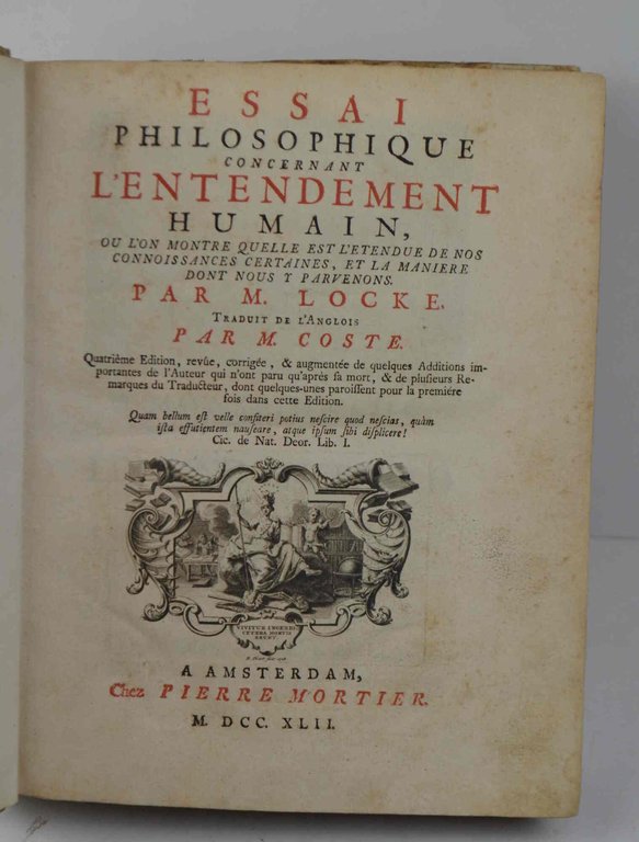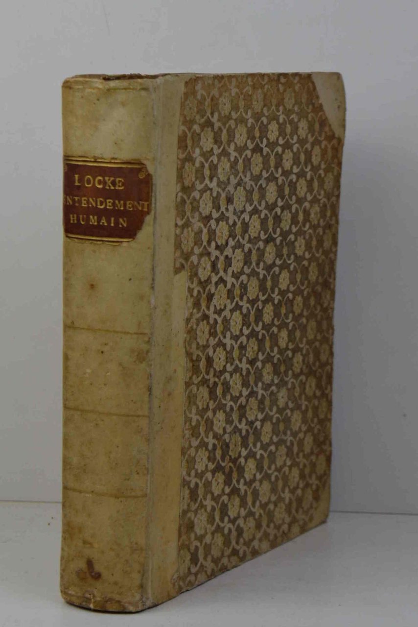 Cm. 25,5, pp. xlii, 603 (19). Ritratto di Locke f.t. inciso in rame, frontespizio in rosso e nero con grande fregio centrale. Legatura del tempo in mezza pergamena con punte. Carte a tratti brunite, peraltro esemplare genuino ed in discreto stato di conservazione. Quarta edizione della traduzione francese in cui appaiono notevoli variazioni rispetto all'originale.