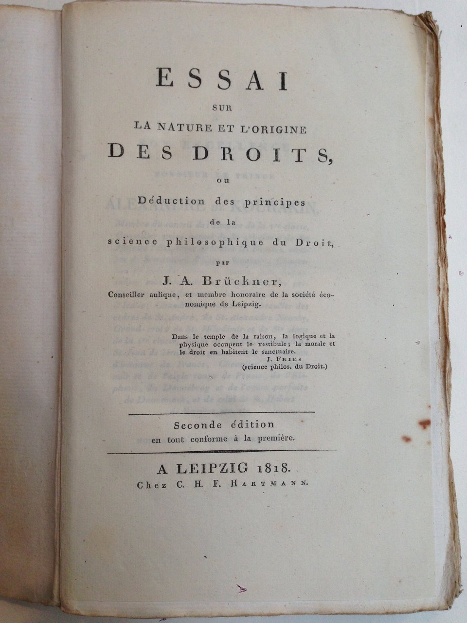 Essai sur la nature et l'origine des droits, ou Deduction des principes de la science philosophique du droit, par J.A. Bruckner.