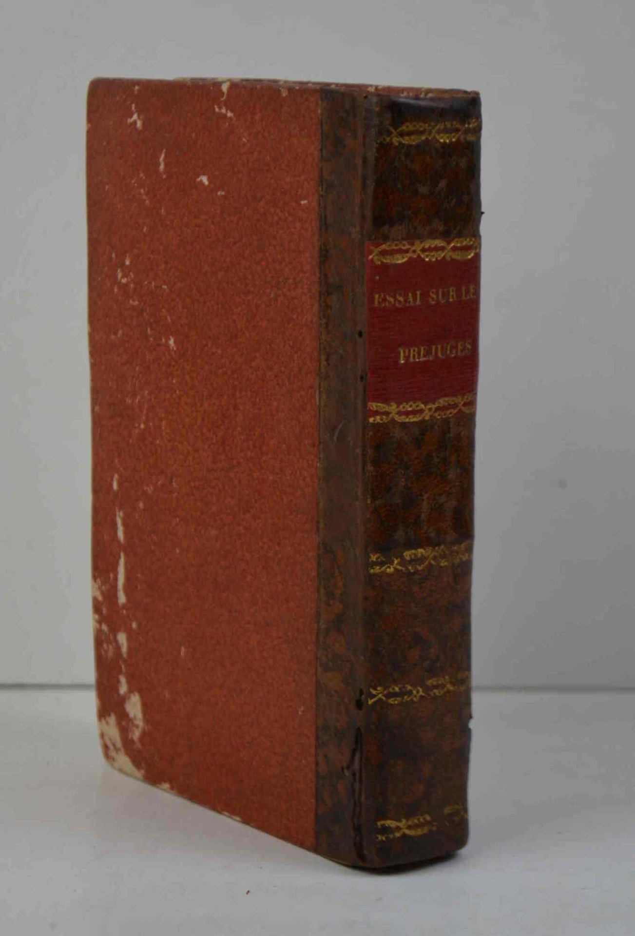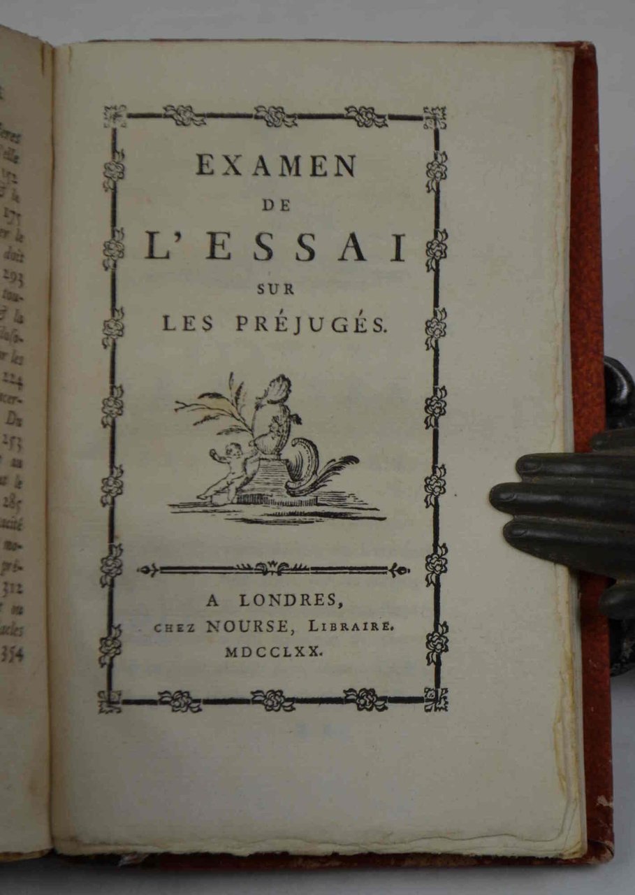 Pp. (4) 394 + (2) di table. Unito a: Examen de l'essai sur les Préjugés. A Londres chez Nourse, 1770. Pp. 70 (2). Frontespizio inquadrato da fregio xilografico e con figura centrale. Due opere in un volume di cm. 16,5. Solida legatura di poco posteriore in mezza pelle, dorso liscio con fregi e titoli in oro su tassello. Qualche forellino lungo le cerniere, peraltro esemplare particolarmente fresco, marginoso e pulito. In ottimo stato di conservazione. Edizione originale, rara di quest'opera fra le più interessanti del Barone d'Holbach pubblicata lo stesso anno della sua più celebre: Système de la nature, ou des lois du monde physique et du monde moral.