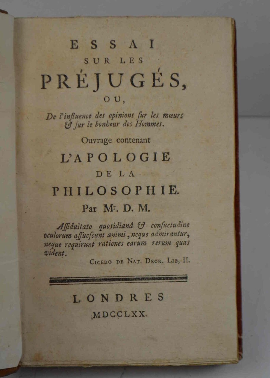 Essai sur les Préjugés, ou, De l'influence des opinions sur les moeurs & sur le bonheur des Hommes. Ouvrage contenant l'apologie de la philosophie. Par Mr. D.M...