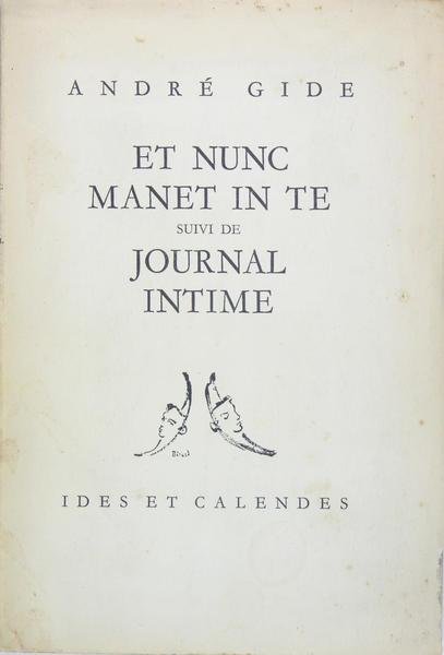 Ides et calendes, 1951. In/8 (19 x 13 cm) broché, couverture illustrée d'une vignette, 119 pages. "Gide André – Et nunc manet in te suivi de Journal intime : André Gide a tenu un journal intime pendant près de 60 ans. «Et nunc manet in te» et «Journal intime» sont une tranche de son journal, celle écrite après la mort de sa femme Madeleine. Rédigeant sans aucun artifice littéraire, il raconte certains faits marquants de sa vie conjugale, complexe et torturée. La mort de Madeleine a été une grande douleur pour Gide, qu’il tente certainement de conjurer avec ce plaidoyer qui fait revivre ses souvenirs."