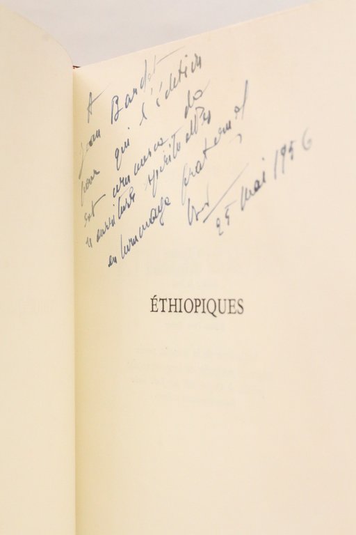 Seuil | Paris 1956 | 14.50 x 19 cm | relié | [ENGLISH DESCRIPTION ON DEMAND] | Edition originale, un des 25 exemplaires numérotés sur vélin neige, seuls grands papiers. Bel exemplaire. Reliure en demi maroquin rouge, dos lisse, date dorée en queue, encadrement d'un filet doré sur les plats de papier à motifs africanisants, gardes et contreplats de papier bordeaux, couvertures et dos conservés, rhodoïd conservé (une petite déchirure avec décharge de papier du second plat sur le rhodoïd), tête dorée, reliure signée P. Goy & C. Vilaine. Envoi autographe signé de Léopold Sédar Senghor à Jean Bardet, co-fondateur avec Paul Flamand des éditions du Seuil.