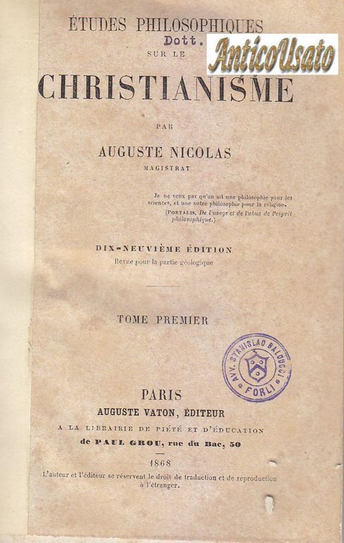 ETUDES PHILOSOPHIQUES SUR LE CHRISTIANISME di Augustes Nicolas