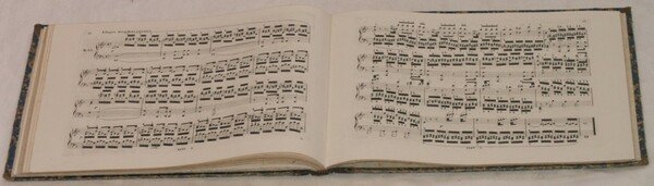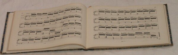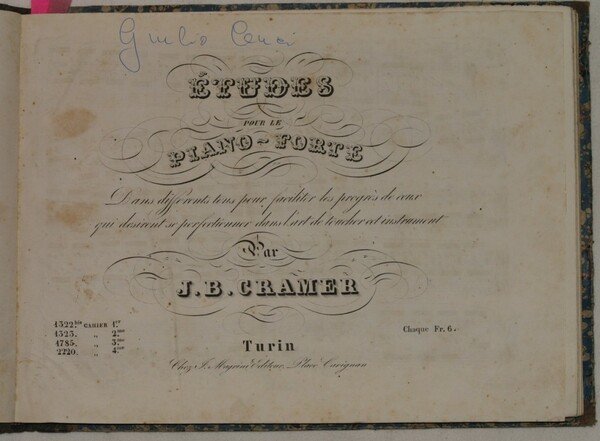 In 4. Dim. 25x33 cm. Pp. 35+35+43+45. Bella raccolta di quattro studi per pianoforte in un volume oblungo del noto pianista e compositore di pianoforte Johann Baptiste Cramer (1771-1858).<BR>Senza data ma della metà del XIX secolo. Cramer è famoso per i suoi studi che vennero pubblicati in numerose edizioni e divennero pezzi fondamentali per lo studio di questo strumento. Firma al frontespizio del primo studio. In buone condizioni. Copertina in mezza pelle in buone condizioni generali con usure ai margini, dorso e piatti. Legatura in buone condizioni. All'interno le pagine si presentano in ottime condizioni con rare fioriture a parte il frontespizio del primo studio. Beautiful collection of four studies for piano in one oblong volume by the famous pianist and composer Johann Baptiste Cramer (1771-1858). Not dated but of around 1850. Cramer is famous for his studies, published in different editions and fundamental for the study of this instrument. Signature in the title page of the first title page. In good conditions. Half leather cover in good general conditions with worn in edges, spine and plates. Binding in good conditions. Inside pages are in very good conditions with occasional foxings apart for the title page fo the first volume with foxings.