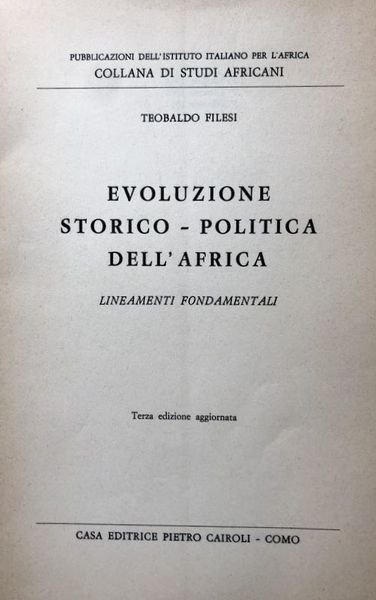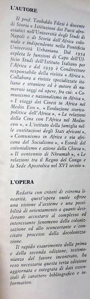 Soggetti: Africa, Storia Contemporanea, Evoluzione storico-politica, Paesi africani, Origini, Colonialismo, Colonie, Imperialismo, Geopolitica, Economia, Terzo Mondo, Decolonizzazione, Sviluppo economico, Marxismo, Sindacalismo, Indipendenza, Dipendenza, Risorse energetiche, Materie prime, Guerre, Tribù, Società tribali, Clan, Etnie, Liberazione, Neri, Bianchi, Schiavitù, Apartheid, Razzismo, Imperi, Conquista, Conferenze di Berlino, Grandi Potenze, Guerre mondiali, Società, Cultura, Europa, Francia, Olanda, Spagna, Portogallo, Italia, Somalia, Libia, Eritrea, Fascismo, Ginevra, Mandati internazionali, Congo, Belgio, Africa Nera, Kenia, Rhodesia, Sudan, Monomotapa, Etiopia, Zanzibar, Liberia, Ghana, Mali, Nigeria, Togo, Sierra Leone, Commonwealth, Risveglio africano, M.A. Garey, Movimento pan-negro, W.E. Burghardt Du Bois, Maghreb, Socialismo, Comunismo, Nazionalismo, Costituzioni, Tutela, Amministrazione, ONU, Panafricanismo, Totalitarismo, Regimi, Dittatori, Syndicalisme, Afrique, Politique internationale, Noirs, Colonies, Libri Vintage, Fuori catalogo, Saggi, Bibliografia, Africa, Contemporary History, Historical-political evolution, African countries, Origins, Colonialism, Colonies, Imperialism, Geopolitics, Economy, Third World, Decolonization, Economic development, Trade unionism, Independence, Dependence, Energy resources, Raw materials, Wars, Tribes, Society tribals, Clans, Ethnic groups, Liberation, Blacks, Whites, Slavery, Racism, Empires, Conquest, Conferences, Great powers, World wars, Society, Culture, Europe, France, Holland, Spain, Portugal, Italy, Somalia, Libya, Eritrea, Fascism, Geneva, International mandates, Belgium, Black Africa, Kenya, Ethiopia, African awakening, Pan-Negro movement, Socialism, Communism, Nationalism, Constitutions, Protection, Administration, UN, Pan-Africanism, Totalitarianism, Regimes, Dictators, Out of print Books, Essays, Bibliography