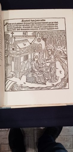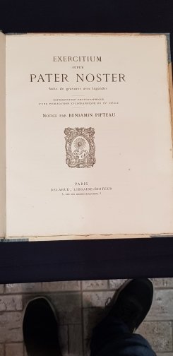 In-4°, pp. X, 10 tavole f.t. di riproduzioni di antiche xilografie, mezza tela con titolo al dorso, brossure editoriali conservate all'interno. BELLISSIMA EDIZIONE stampata su carta vergata che riproduce un'opera xilografica stampata nel XV secolo con prefazione introduttiva di Benjamin Pifteau. L'Exercitium super Pater noster è costituito da dieci fogli stampati solo al verso, scritti in caratteri gotici e in lingua latina. Ogni pagina, contiene in alto una frase della preghiera, seguita da quattro lunghe righe di testo, a titolo di commento, e, in basso, un disegno in nero, raffigurante una scena adattata al testo.