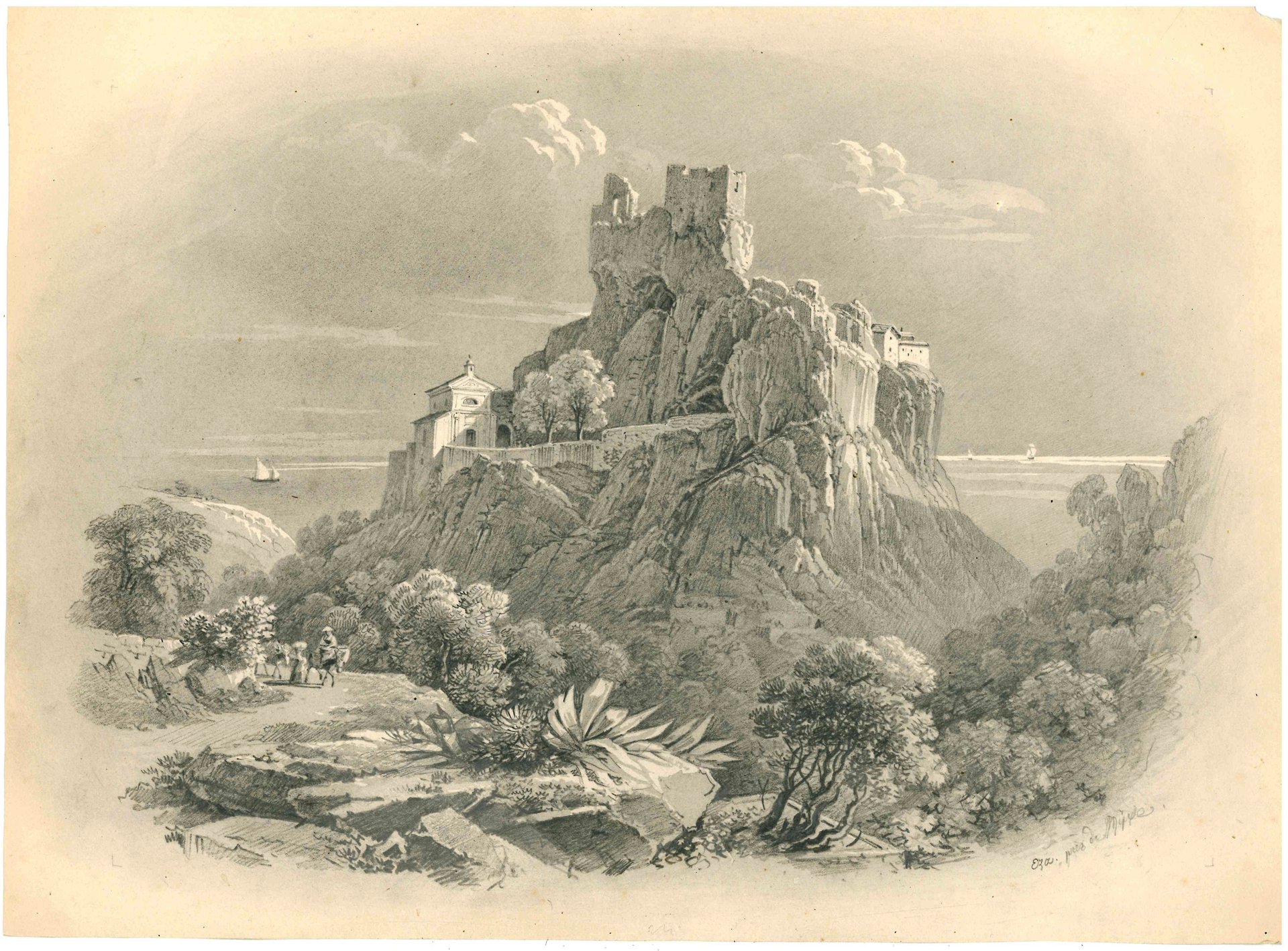 Disegno a matita (mm 290x396), piccola mancanza in alto a destra, ma nel complesso molto ben conservato. Protetto da una struttura di sostegno con iscrizioni successive a penna e carta velina. Il titolo è riportato a matita nell'angolo in basso a destra del disegno “Vista della città di Eze vicino a Nizza”.