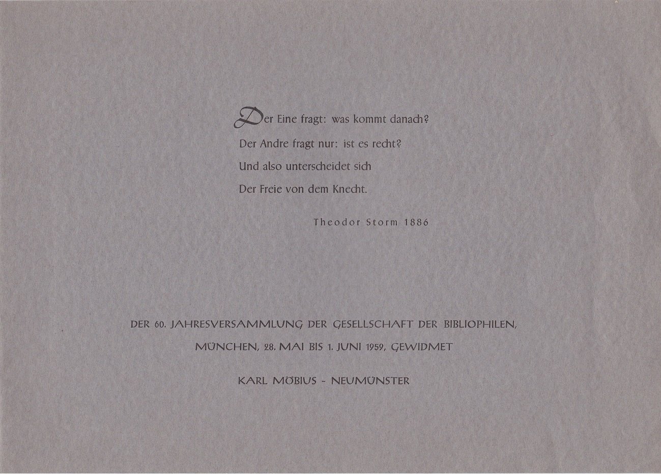 Gabe aus dem Jahr 1959 für die Gesellschaft der Bibliophilen in München mit dem Faksimile-Blatt eines Texts von Theodor Storm. Der bekannte Text von Storm ("Der eine fragt: Was kommt danach? / Der andere fragt nur: Ist es recht? / Und also unterscheidet sich / Der Freie von dem Knecht") wird zunächst auf dem Deckel wiedergegeben und dann auf separatem Blatt innen faksimiliert. Das Blatt hat ein Maß von ca. 12,8 x 21,1 cm. Handschrift und Signatur sind in schwarzer Farbe faksimiliert, das Blatt befindet sich in sehr gutem Zustand.