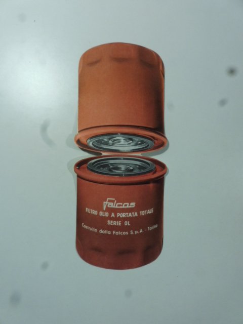 Pieghevole fustellato cm 9 x 12,5 a forma di filtro d'olio Falcos, all'interno alcune note sulla cartuccia a filtraggio costante in uso su automobili Fiat, Alfa Romeo, Lancia, Innocenti. NOn datato ma anni Sessanta circa.