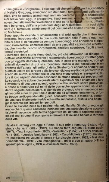 Famiglia e Borghesia sono i due capitoli che compongono questo libro della Ginzburg scritto nel 1977. Due storie di smarrimento e di crisi familiare in cui i personaggi che annodano e dipanano i loro destini sembrano trascinati da una casualità capricciosa che inventa incontri sorprendenti, amicizie scontrose, fragili amori, tenaci avversioni. Come avviene nelle sue pagine migliori, Natalia Ginzburg segue gli arabeschi di queste esistenze incrinate con uno stile distillato, in un sommesso ma implacabile controcanto che reinventa la musica banale e terribile della vita.