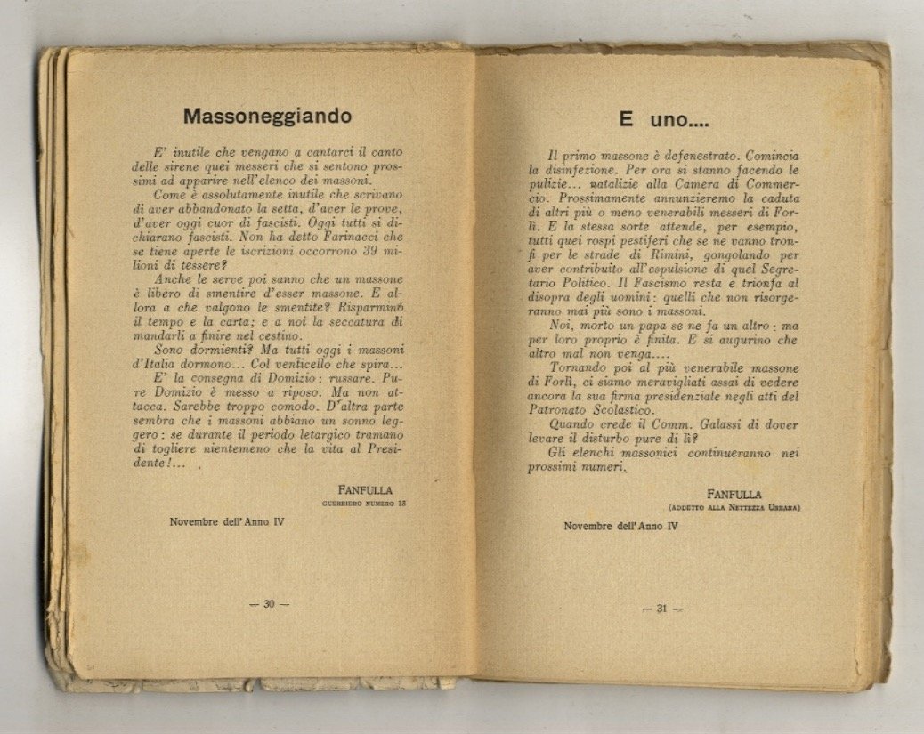 Forlì, Bordandini Editore, [1928], in-16, brossura editoriale con la copertina anteriore figurata, pp. 127, [1]. Lievi tracce d'uso esterne, un foro sul frontespizio (senza perdite di testo). La carta che segue il front. reca un occhietto: "Fanfullate" Libro I. Prefazione di Ivo Oliveti. Articoli satirici estratti dal giornale 'Il Popolo di Romagna' firmati ogni volta: Fanfulla, seguito da un attributo di fantasia.