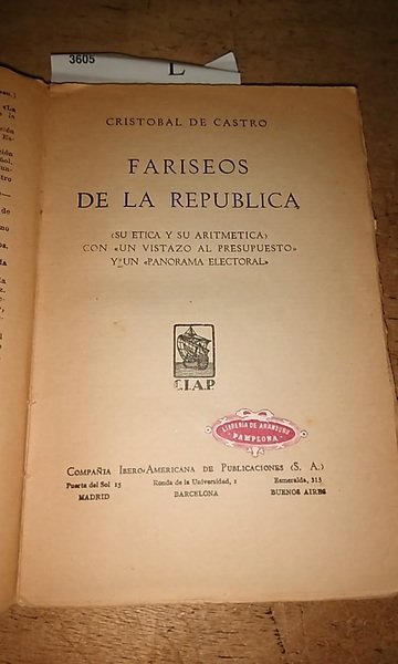 CASTRO, Cristóbal de Fariseos de la República C.I.A.P. Madrid 1933 236 p. (19 cm) Rustica. Deslucido (Su ética y su aritmética) Con “Un vistazo al presupuesto” y un “Panorama electoral”. L (Ref.3605) literatura politica ensayo segunda republica historia contemporanea