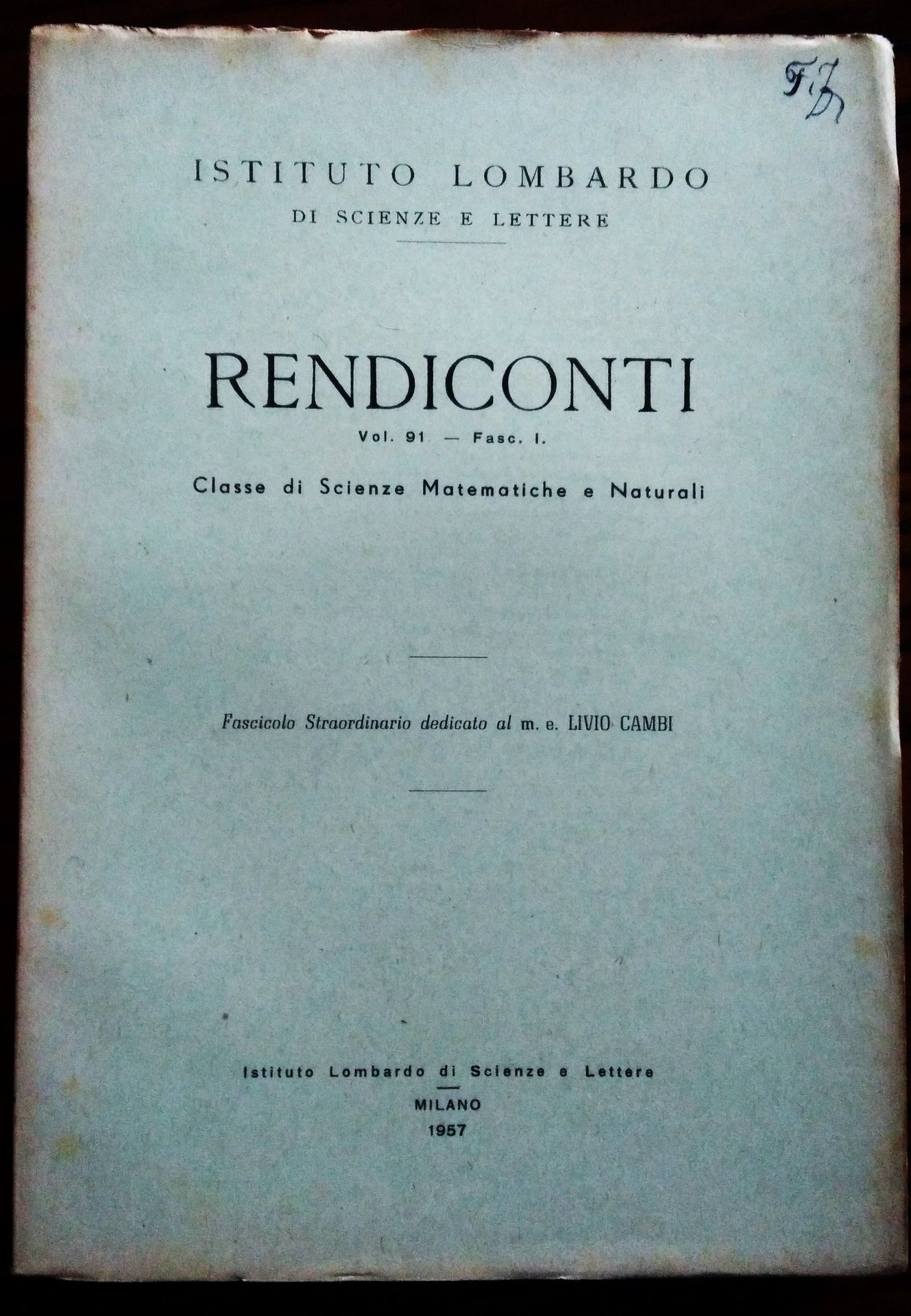 Rendiconti Dell'Istituto Lombardo di Scienze e Lettere. Vol.91 - Fasc. I. Classe di Scienze Matematiche e Naturali, Milano, 1957. 8°, pp. 346, un ritratto, brossura editoriale. Leggermente scuriti i margini interni della brossura, bella copia. Sigla di possesso alla copertina( Francesco Zagar).