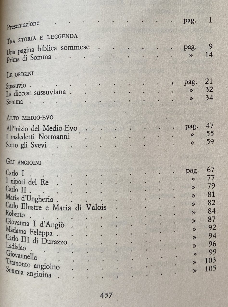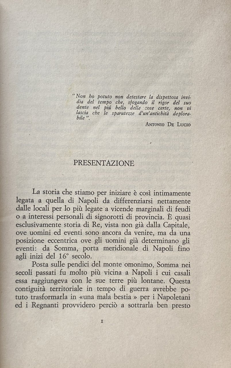 La storia che stiamo per iniziare è così intimamente legata a quella di Napoli da differenziarsi nettamente dalle locali per lo più legate a vicende marginali di feudi o a interessi personali di signorotti di provincia. È quasi esclusivamente storia di Re, vista non già dalla Capitale, ove uomini ed eventi sono ancora da venire, ma da una posizione eccentrica ove gli uomini già determinano gli eventi: da Somma, porta meridionale di Napoli fino agli inizi del 16° secolo. ...